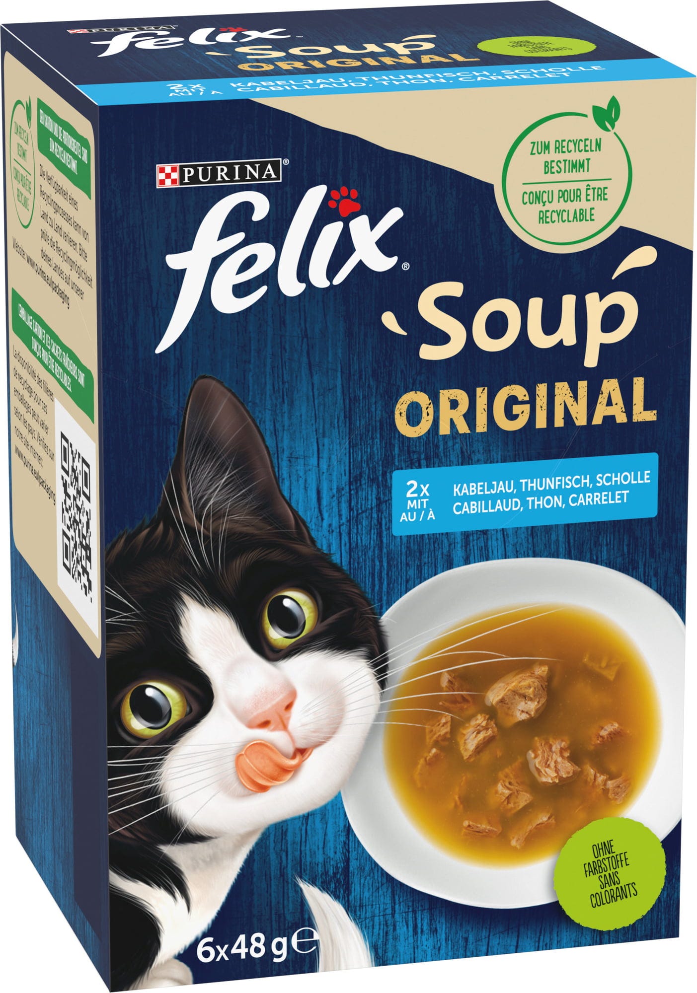 Každé balení Felix polévka obsahuje 6 porcí po 48 g mokrého krmiva připraveného k podávání. Dobrou chuť!