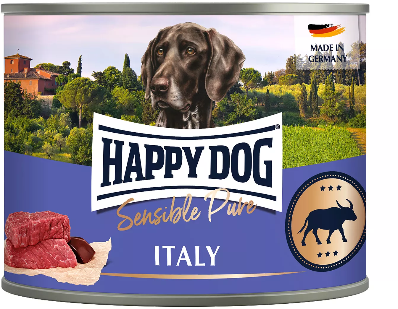 Happy Dog Sensible Pure Italy je delikatesa pro dospělé psy, kteří trpí potravinovou intolerancí. Vyrábí se výhradně v Německu a připravuje se z vybraného buvolího masa a vnitřností. Toto mokré krmivo bez obilovin a sóji neobsahuje žádná umělá barviva ani aromata, naopak obsahuje 100 % živočišných bílkovin.