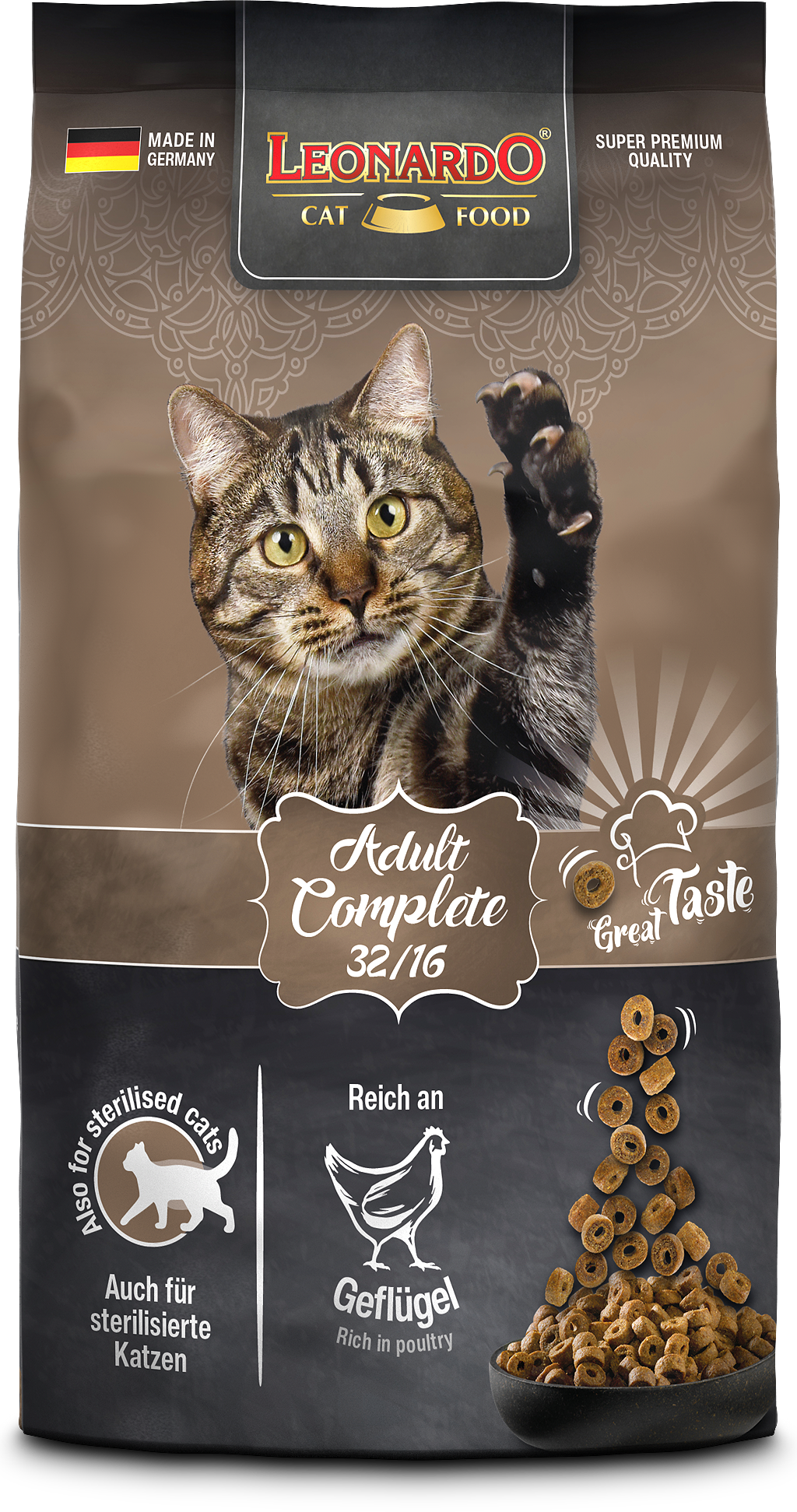 Adult Complete 32/16 - suché krmivo s nízkým obsahem energie (16 %) je ideální volbou pro kočky s nižší aktivitou. Vhodné i pro kastrované kočky. Obsahuje extra čerstvou drůbež, lněné semínko, pivovarské kvasnice a slad.
