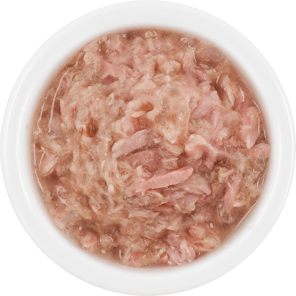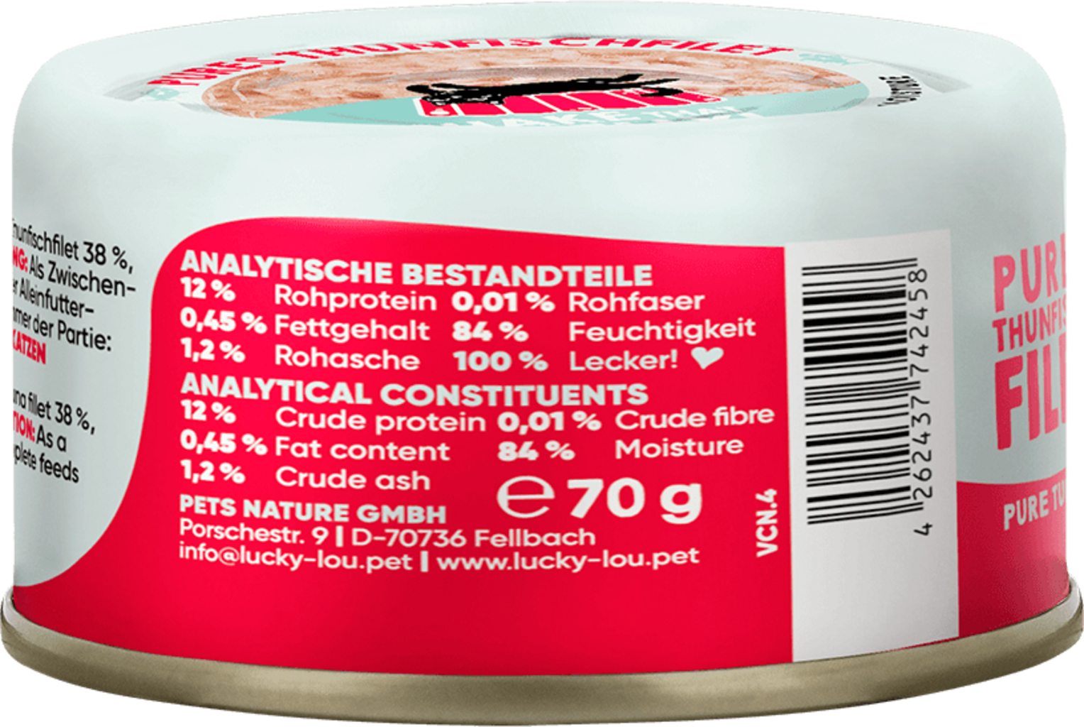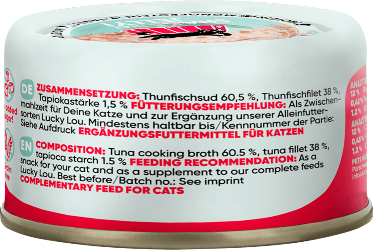 60,5 % vývar z tuňáka, 38 % filety z tuňáka, 1,5 % Tapiokový škrob