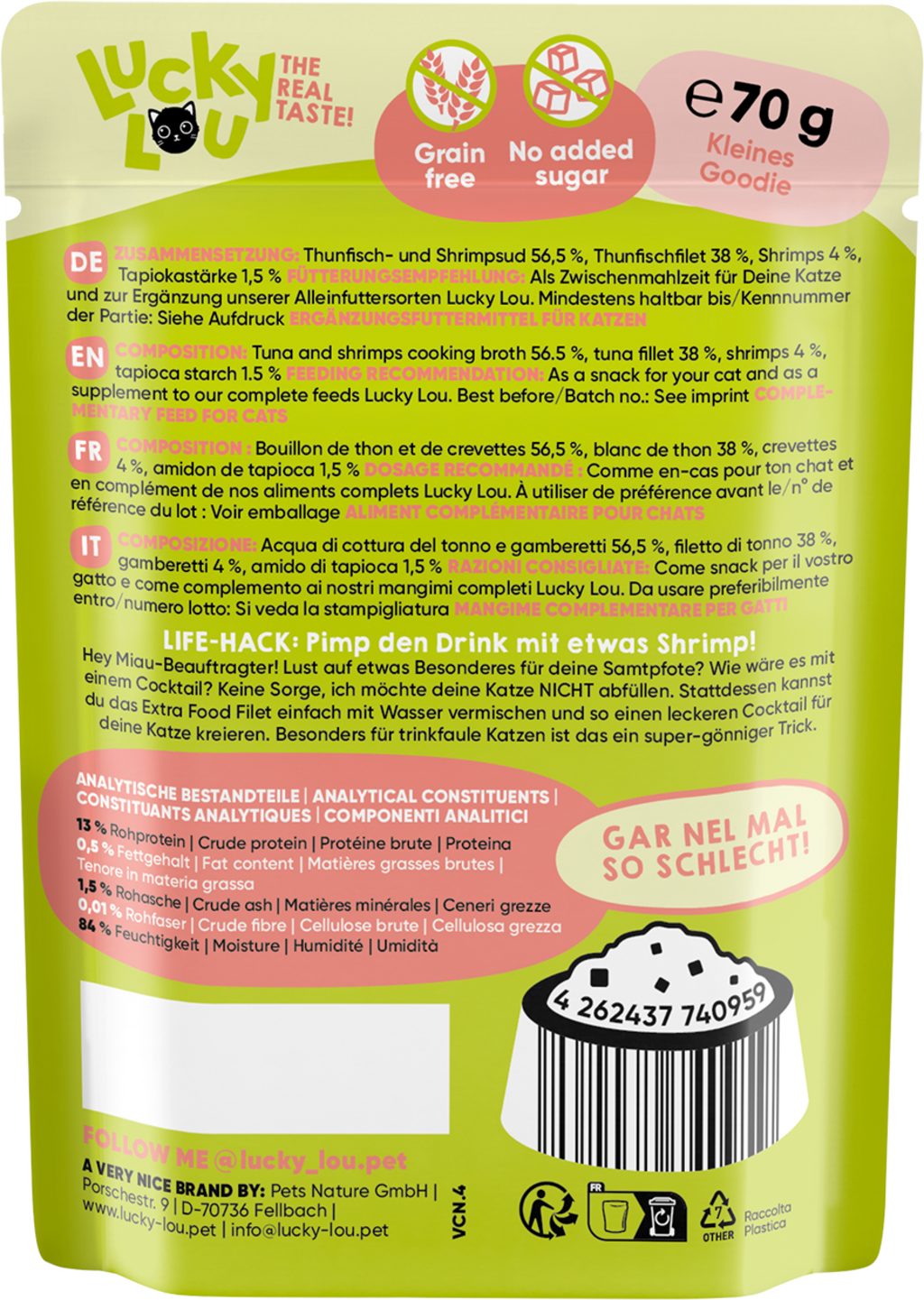 - Podávejte Lucky Lou Extra Food jako svačinku nebo jako doplněk k hlavnímu krmivu Vaší kočky.