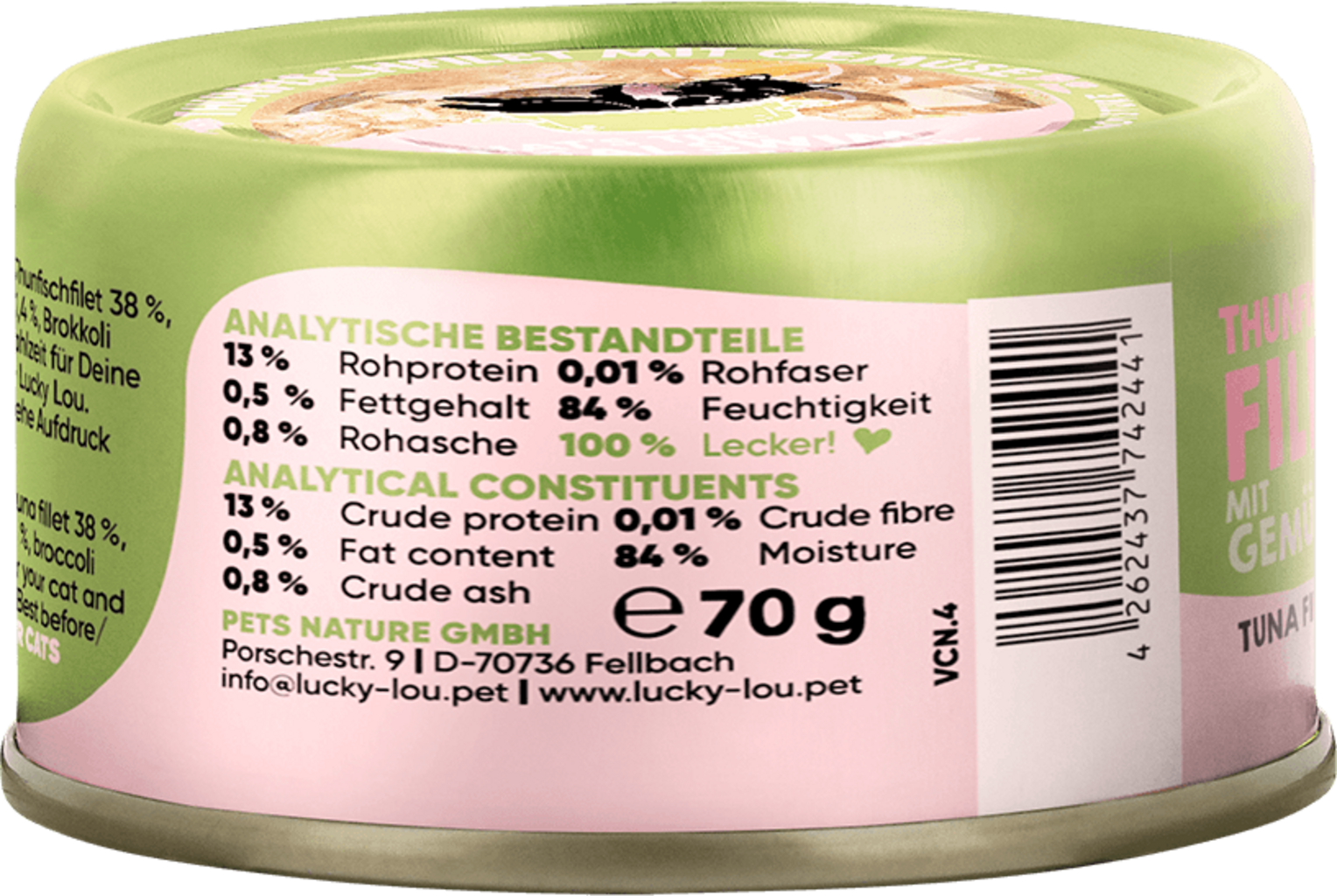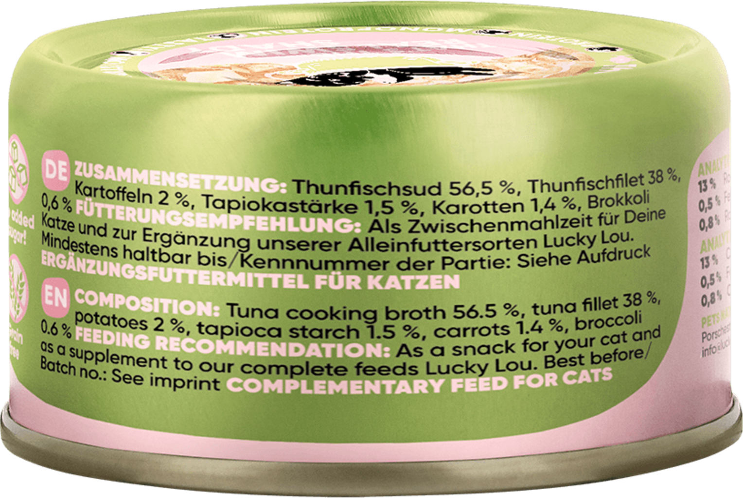 56,5 % vývar z tuňáka, 38 % filety z tuňáka, 2 % brambory, 1,5 % Tapiokový škrob, 1,4 % mrkve, 0,6 % brokolice