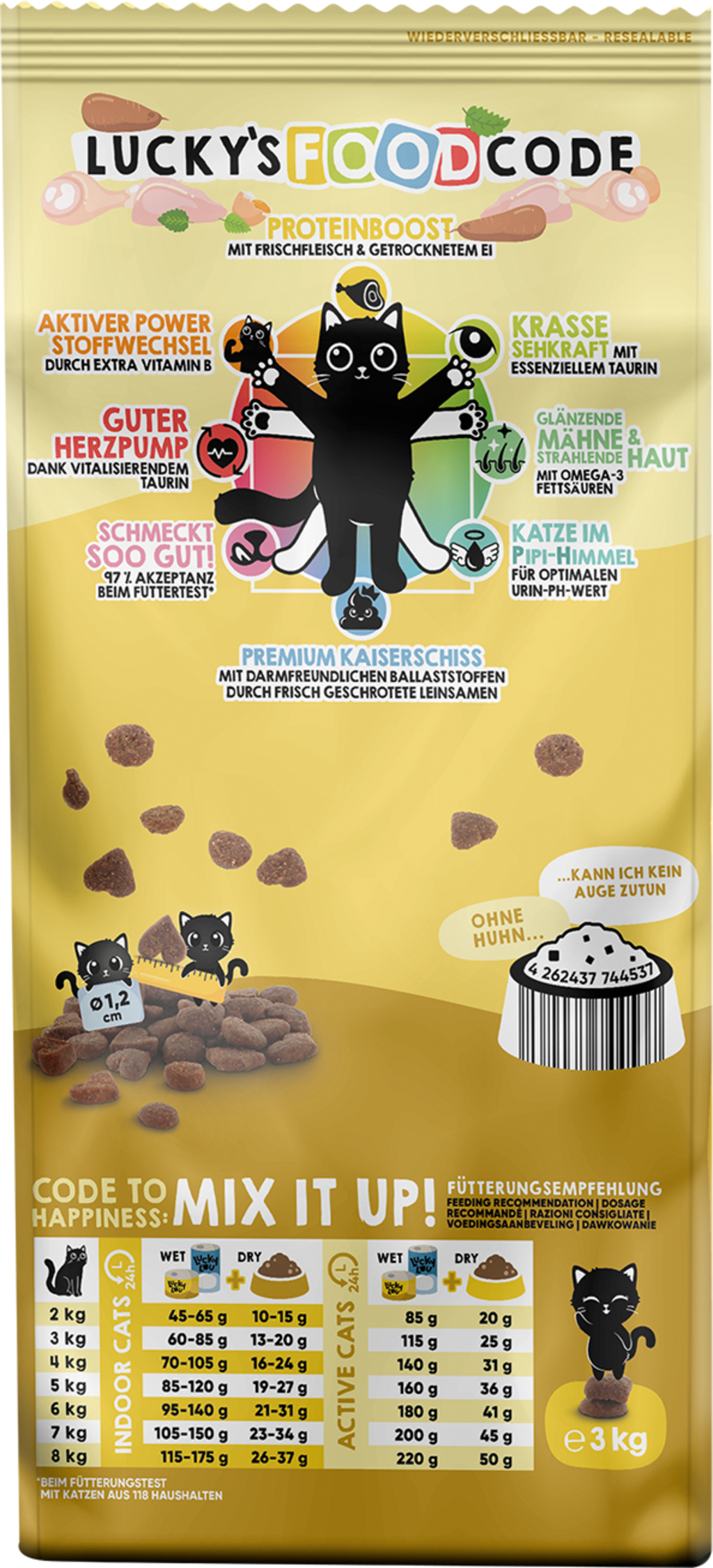 Lucky Lou Food Code jsou špičkové granule, které nejen neodolatelně křupavě chutnají, ale také Vaší kočce poskytují hodnotné živiny odpovídající jejímu věku. Vyvážená receptura tohoto suchého krmiva, inspirovaná dokonalými proporcemi Vitruviánského muže Leonarda da Vinciho, nabízí u každé varianty 8 benefitů, které Vaši kočku hýčkají komplexně od hlavy až k patě.
