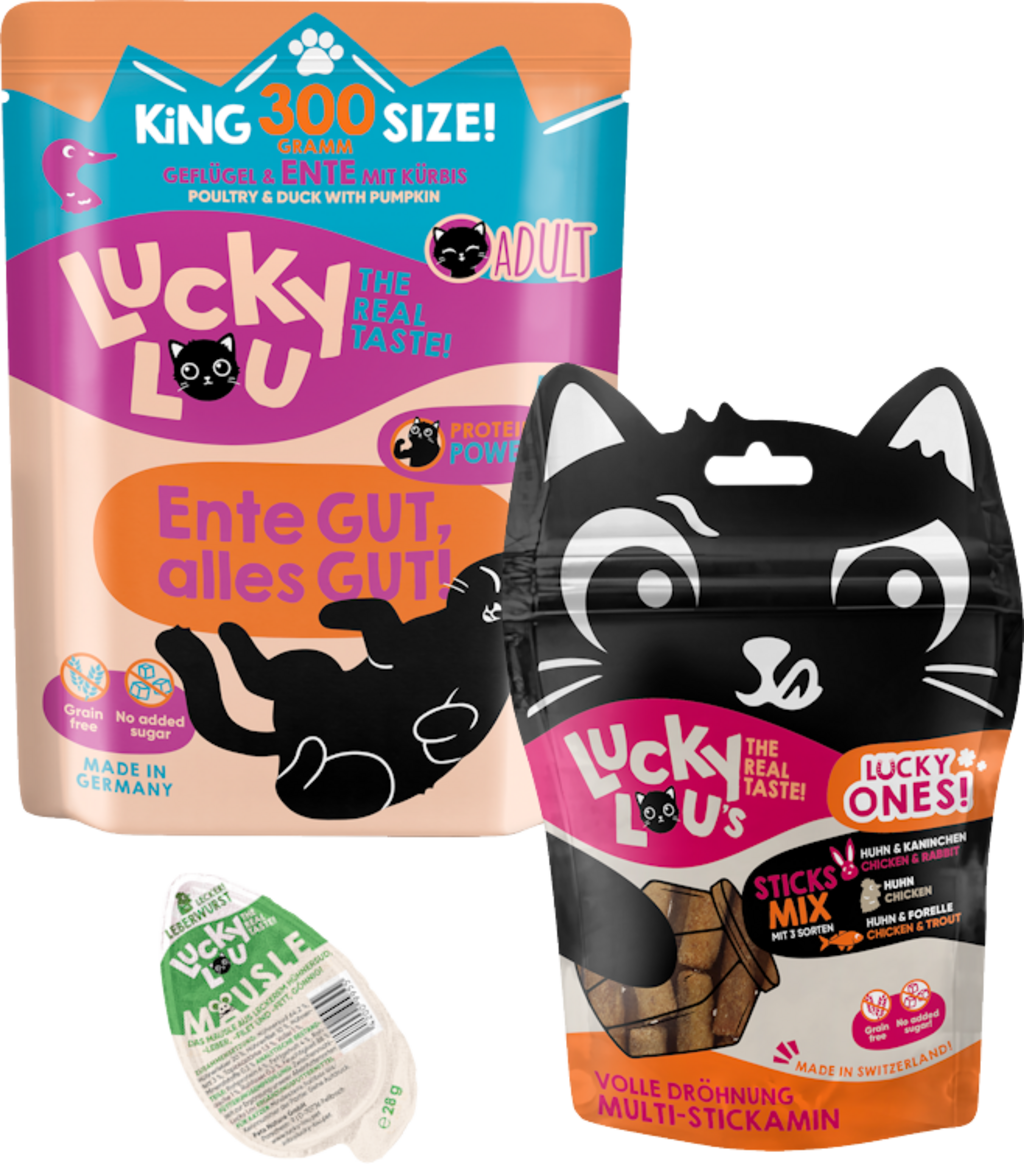 - Obsah: 1 x Life Stage Adult drůbeží & kachna s dýní 300 g, 1 x Lucky Ones Sticks Mixpack 50 g, 1 x Lucky Lou® Mäusle játrovka 28 g