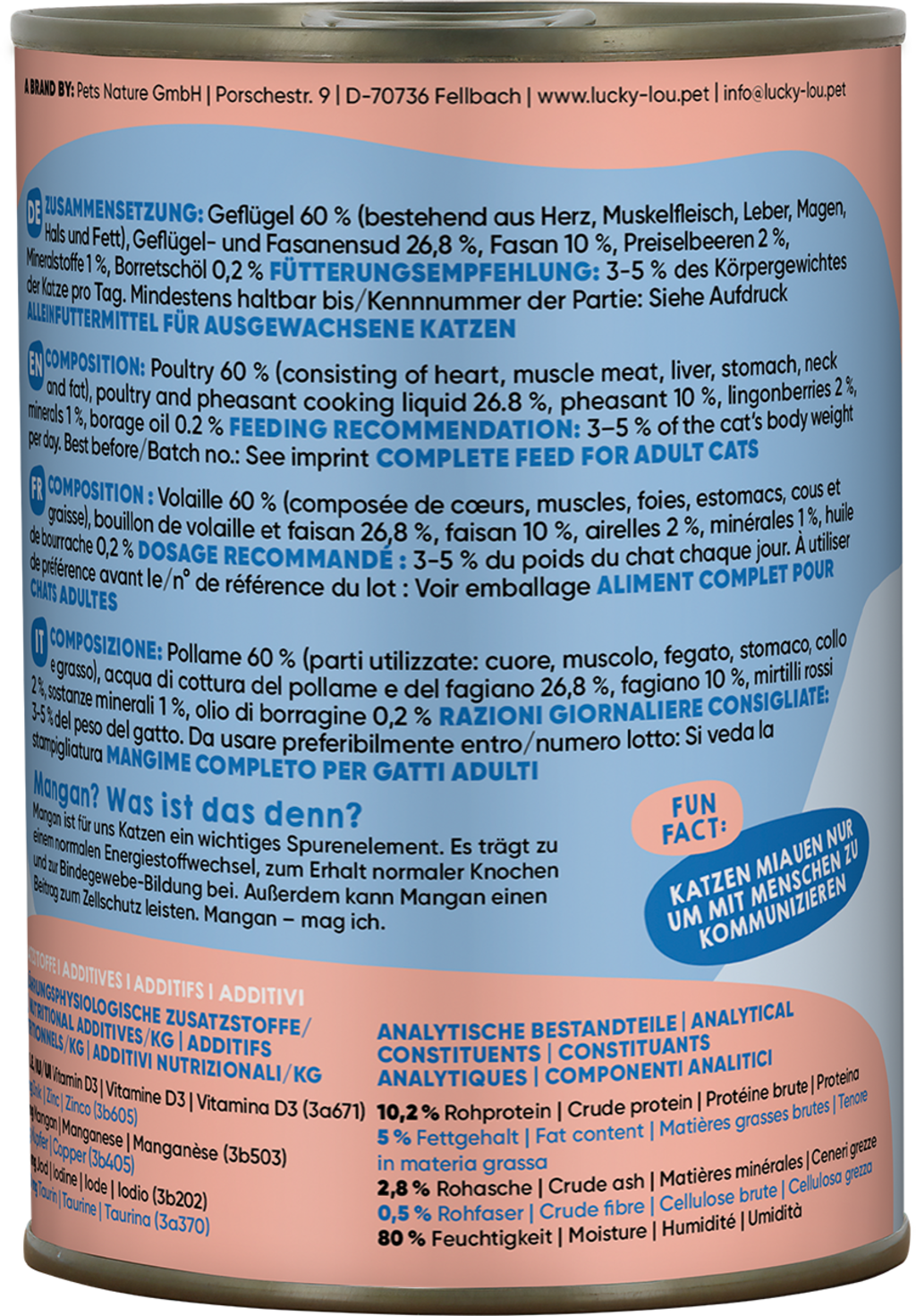 60 % drůbež (srdce, svalovina, játra, žaludek, krk, tuk), 26,8 % drůbeží a bažantí vývar, 10 % bažant, 2 % brusinky, 1 % minerály, 0,2 % brutnákový olej