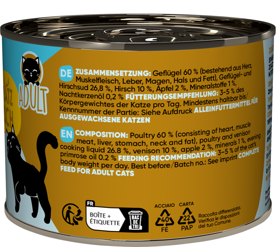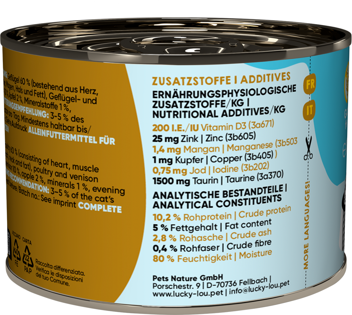 60 % drůbež (srdce, svalovina, játra, žaludek, krk, tuk), 26,8 % vývar z drůbeže a ze zvěřiny, 10 % jelen, 2 % jablka, 1 % minerály, 0,2 % pupalkový olej