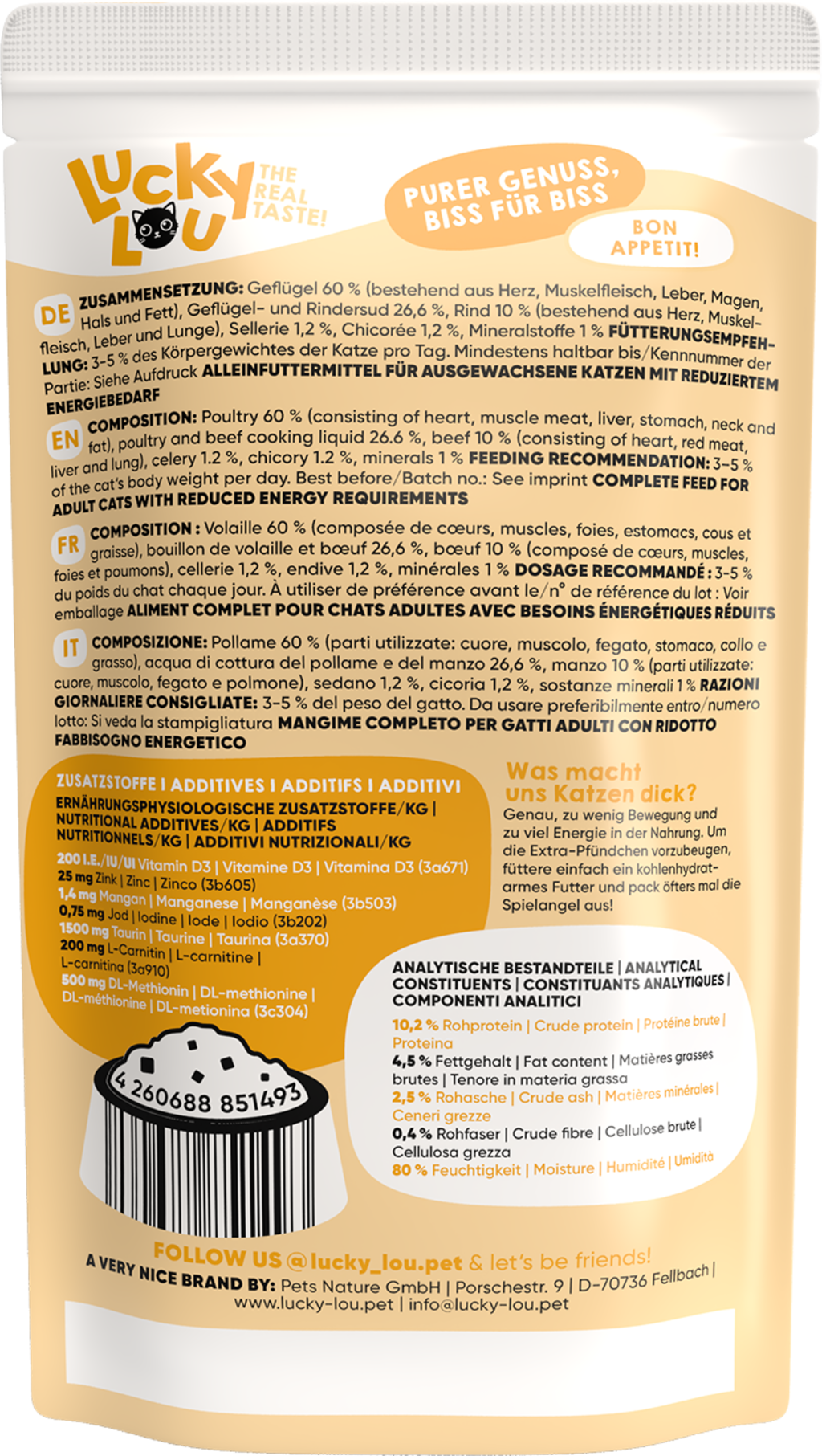 Pozor, milovníci koček! Toto mokré krmivo poskytuje Vaší kočce vše, co den co den potřebuje, zcela podle vzoru přírody. Představuje tak nejen vysoce kvalitní nutriční základ pro vitální život kočky, ale také chutná naprosto skvěle. Kvůli němu nechá Vaše kočka každou myš bez povšimnutí.