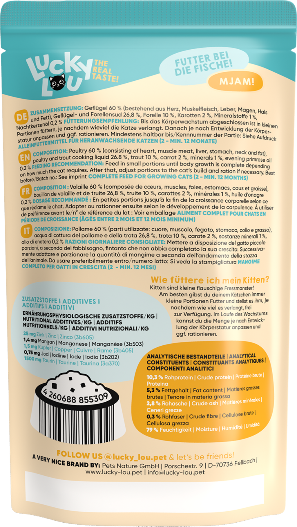 hodnocení pro Lucky Lou Lifestage Pouch Kitten s drůbežím masem a pstruhem (čeština)