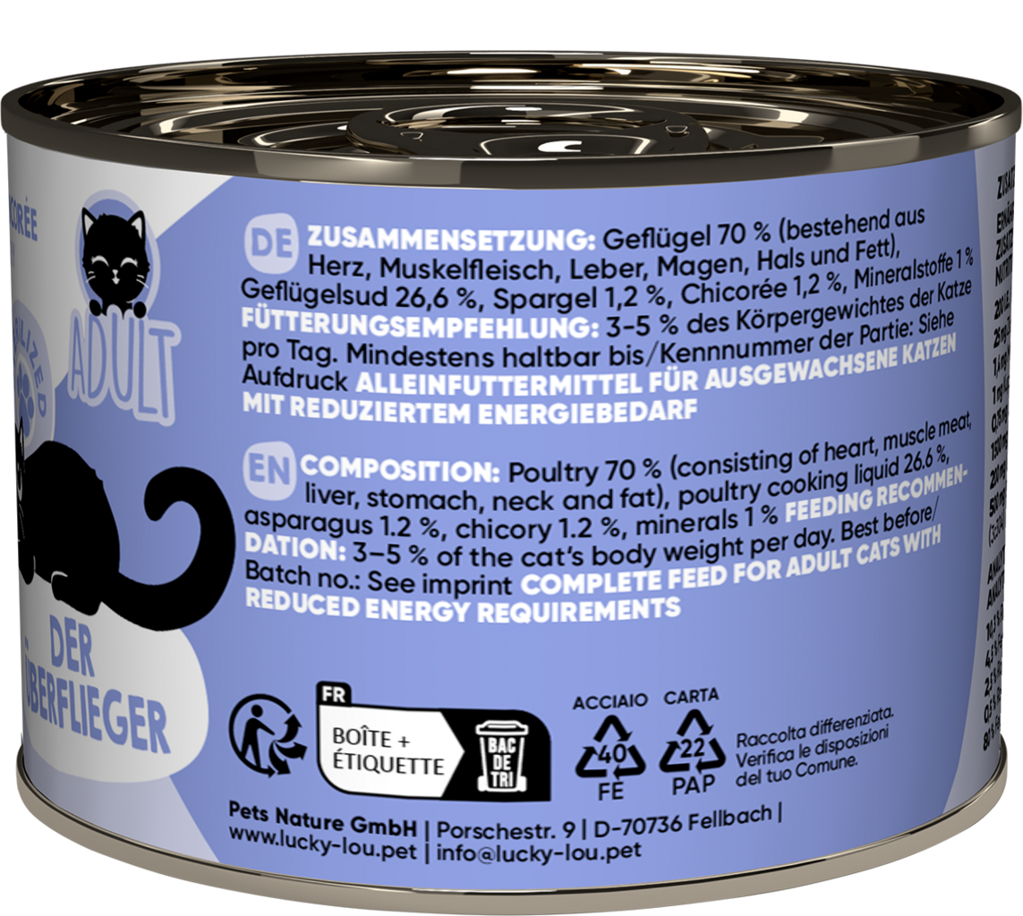 70 % drůbež (srdce, svalovina, játra, žaludek, krk, tuk), 26,6 % kuřecí vývar, 1,2 % chřest, 1,2 % čekanka, 1 % minerály