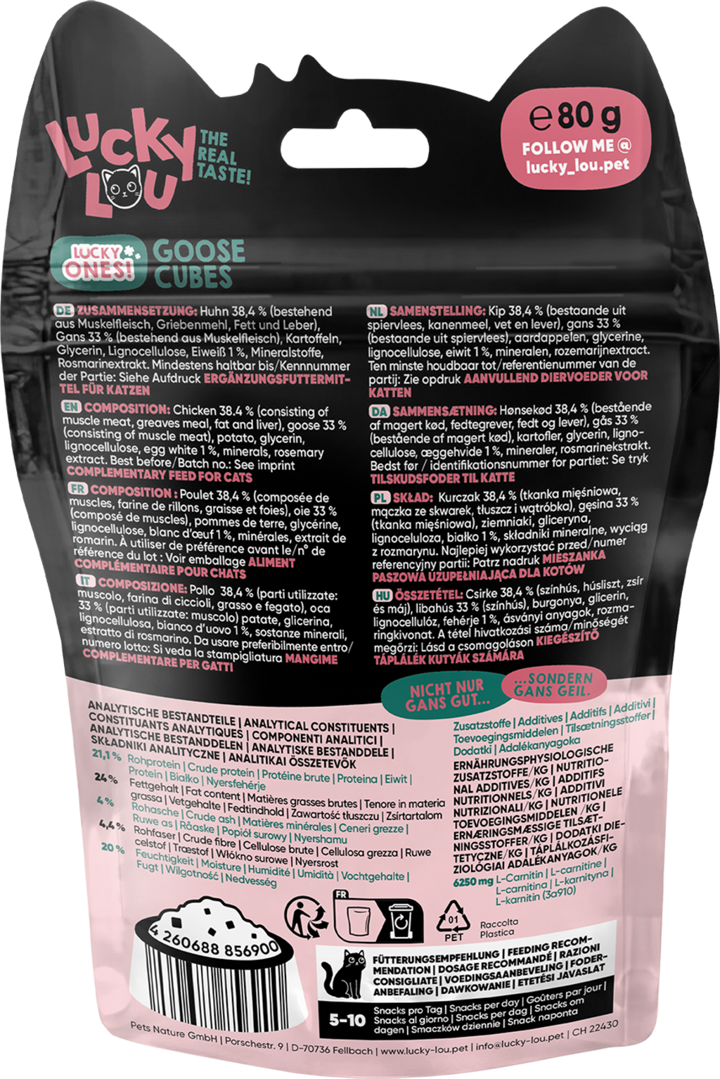 Tyto masové kuličky nenechají žádné kočičí srdce chladným, protože obsahují spoustu ingrediencí vhodných pro kočky, které chutnají prostě neodolatelně. Ať už jako kvalitní pamlsek mezi jídly, jako odměna nebo schované v hračce pro kočky, s lahodnými kostičkami Lucky Ones Cubes můžete své kočce udělat zcela výjimečnou radost.