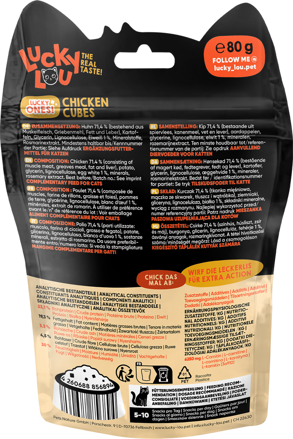 Tyto masové kuličky nenechají žádné kočičí srdce chladným, protože obsahují spoustu ingrediencí vhodných pro kočky, které chutnají prostě neodolatelně. Ať už jako kvalitní pamlsek mezi jídly, jako odměna nebo schované v hračce pro kočky, s lahodnými Lucky Ones Cubes můžete své kočce udělat zcela výjimečnou radost.