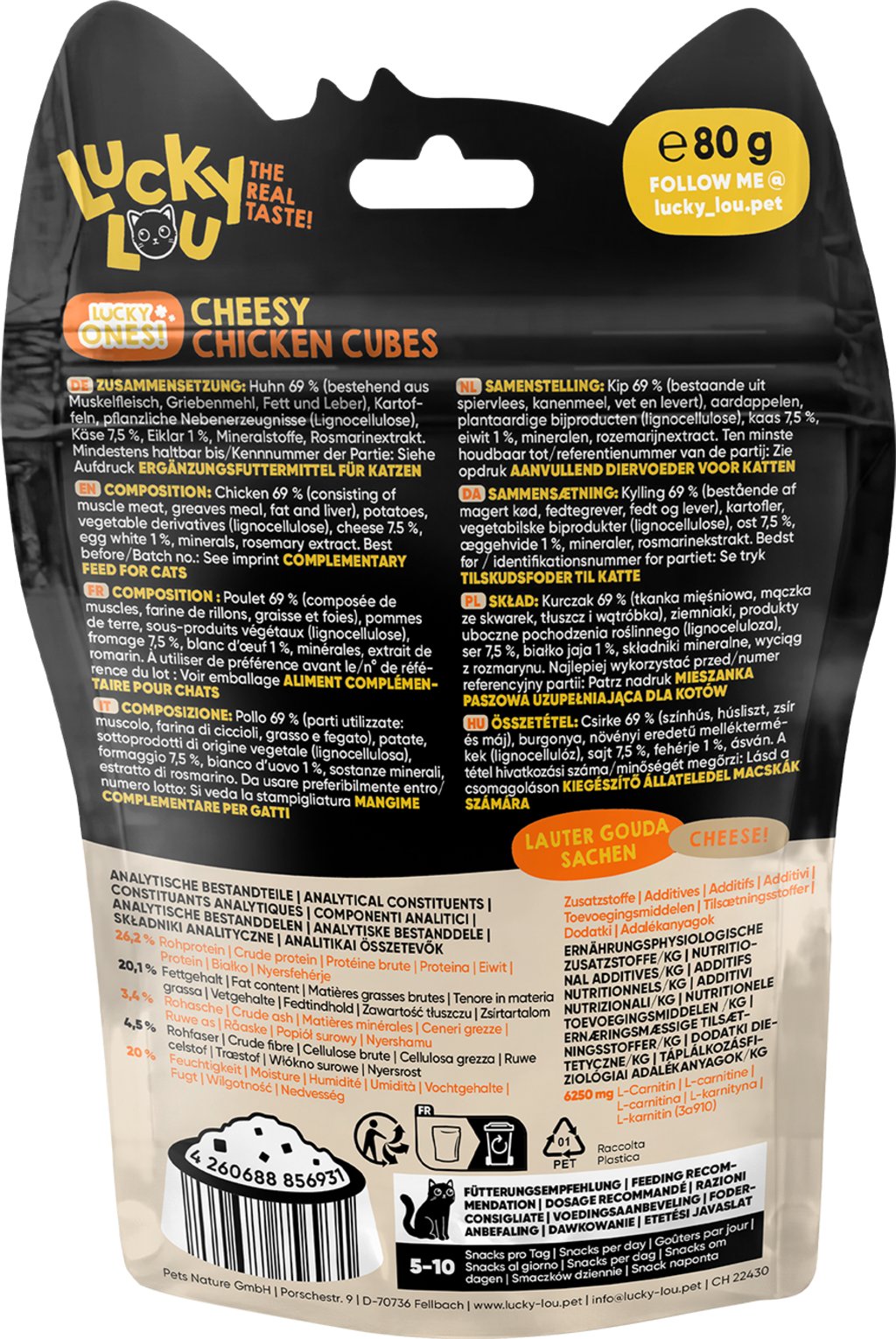 Tyto masové kuličky nenechají žádné kočičí srdce chladným, protože obsahují spoustu ingrediencí přizpůsobených potřebám koček, které chutnají prostě neodolatelně. Ať už jako kvalitní pamlsek mezi jídly, jako odměna nebo schované v hračce pro kočky, s těmito lahodnými kostičkami Lucky Ones Cubes můžete své kočce udělat zcela výjimečnou radost.