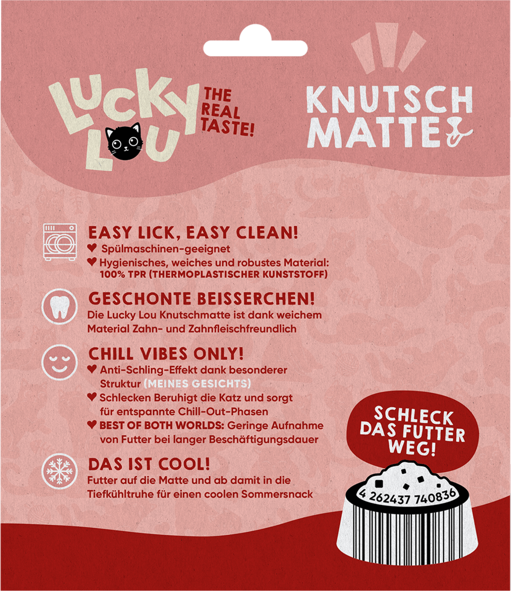 Tato geniální podložka Knutschmatte je nezbytností pro všechny kočky, které při krmení příliš spěchají, protože díky svému efektu proti hltání zajistí okamžité zpomalení. Lízání, mlaskání a vychutnávání – s touto skvělou podložkou se krmení stane úžasnou aktivitou, která přináší neuvěřitelnou zábavu a nedává nudě žádnou šanci. A díky delší době krmení pomáhá tato podložka Vaší kočce také udržet si postavu, protože můžete nepozorovaně snížit množství krmiva. Ale pssst...