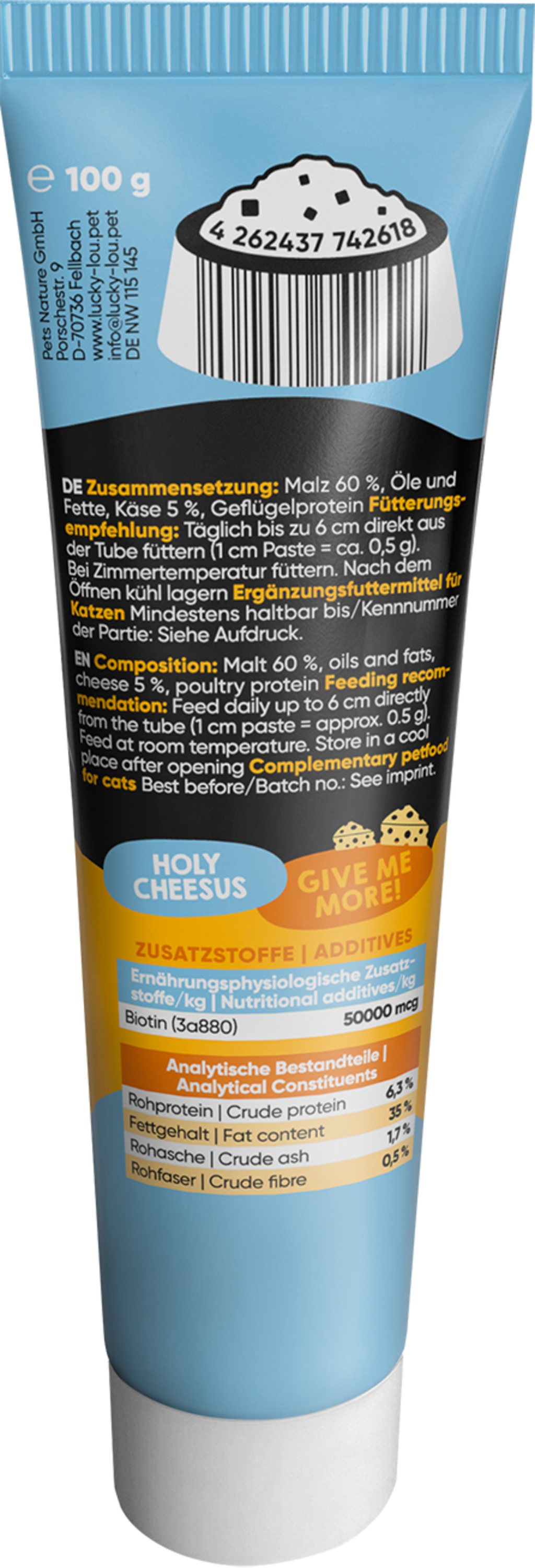 Quetschkopf místo hloupostí! V této tubě se skrývá lahodná pamlsková pasta, která nejenže neodolatelně chutná, ale také Vaší kočce dodává řadu důležitých vitamínů, taurin a slad pro anti-hairball efekt. Ať už ji podáváte z ruky, nebo jako topping na hlavní krmivo, Lucky Lou Quetschköpfe by v jídelníčku Vaší kočky neměly chybět.