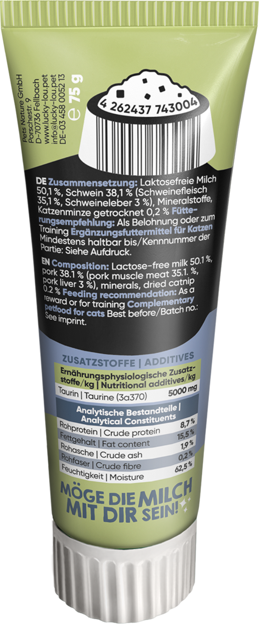 Quetschkopf místo Quatschkopf! V této tubě se ukrývá lahodná snack pasta, která nejenže neodolatelně chutná, ale také Vaší kočce dodá řadu důležitých vitamínů, stejně jako taurin a slad pro anti-hairball efekt. Ať už ji budete podávat z ruky, nebo jako topping na hlavní krmivo, Lucky Lou Quetschköpfe by v jídelníčku Vaší kočky neměly chybět.