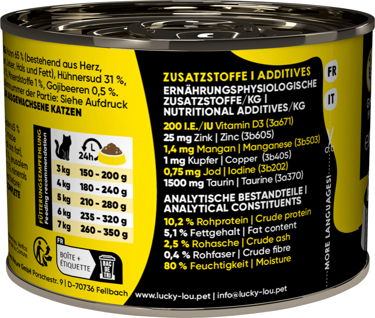 65 % kuře (srdce, svalovina, žaludek, játra, krk, tuk), 31 % kuřecí vývar, 1,5 % topinambur, 1 % kokos, 1 % minerály, 0,5 % goji bobule