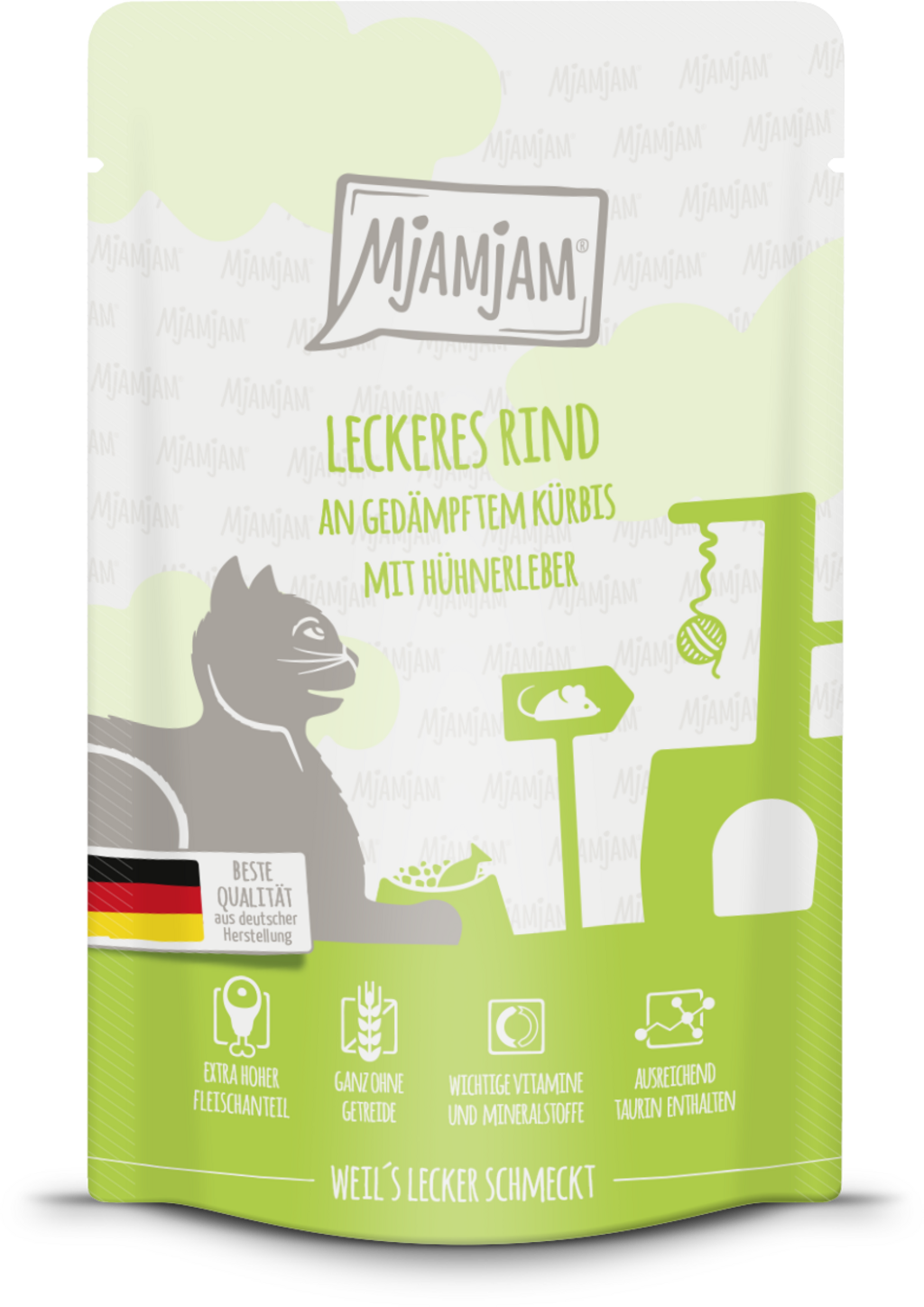 Mjamjam - kapsičky hýčkají Vaši kočku bohatou chutí, nesrovnatelnou kvalitou a špetkou lásky. Vaši kočku čeká plnohodnotné krmivo z čerstvého hovězího masa, dušené dýně a chutných kuřecích jater. Navíc obsahuje taurin, který je pro kočky nezbytný. Aby Vašemu miláčkovi nic nechybělo.