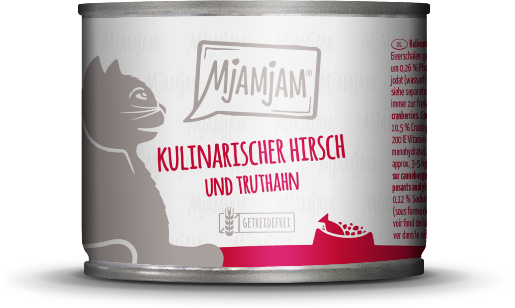Mjamjam - mokré krmivo hýčká Vaši kočku bohatou chutí, nesrovnatelnou kvalitou a špetkou lásky. Vaši kočku čeká plnohodnotné jídlo z vydatného jeleního masa, jemného krůtího masa a ovocných brusinek. Aby Vašemu miláčkovi nic nechybělo.