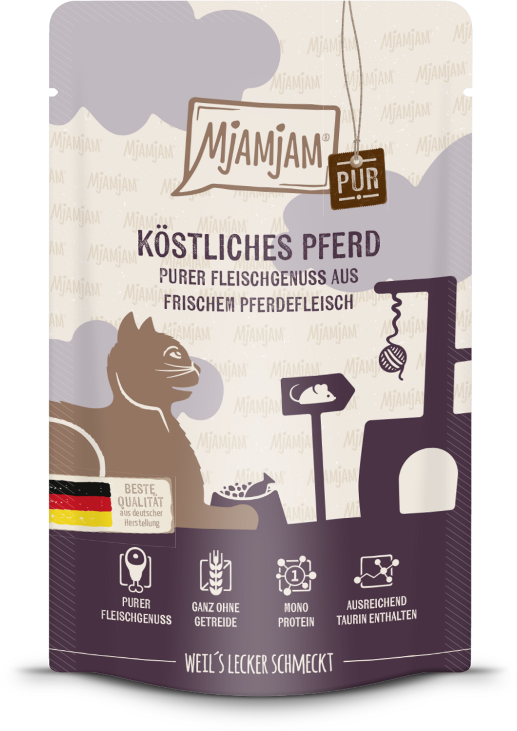 Mjamjam kapsičky hýčkají Vaši kočku bohatou chutí, nesrovnatelnou kvalitou a špetkou lásky. Koňské maso jako jediný zdroj bílkovin zaručeně roztančí chuťové pohárky Vaší kočky a poskytne jí hodnotné, druhově odpovídající krmivo. Navíc obsahuje taurin, který je pro kočky nezbytný. Aby Vašemu miláčkovi nic nechybělo.