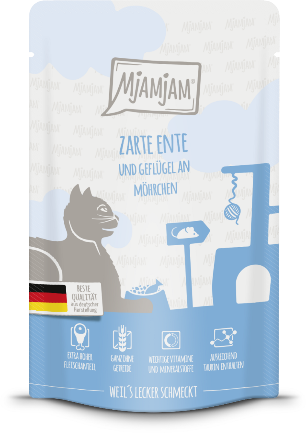 Kapsičky Mjamjam hýčkají Vaši kočku bohatou chutí, nesrovnatelnou kvalitou a špetkou lásky. Vaši kočku čeká plnohodnotné krmivo z čerstvého kachního masa, šťavnaté drůbeže a křupavé mrkve. K tomu je přidán taurin, který je pro kočky důležitý. Aby Vašemu miláčkovi nic nechybělo.