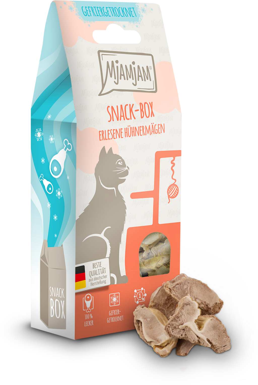 Pamlsky z Mjamjam Snackbox jsou dokonalou odměnou pro Vaši kočku a ideálním způsobem, jak rozmazlovat Vašeho miláčka. Díky chutným kuřecím žaludkům, které jsou šetrně sušeny mrazem, nabízí Snackbox přírodní pochoutku, která Vaši kočku nadchne.