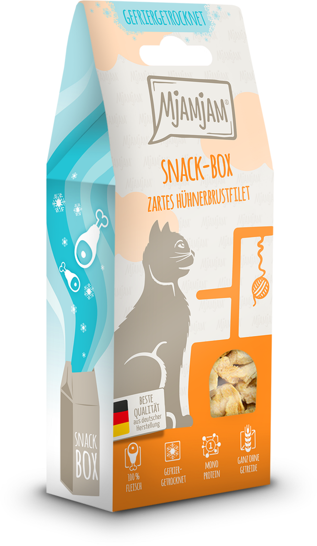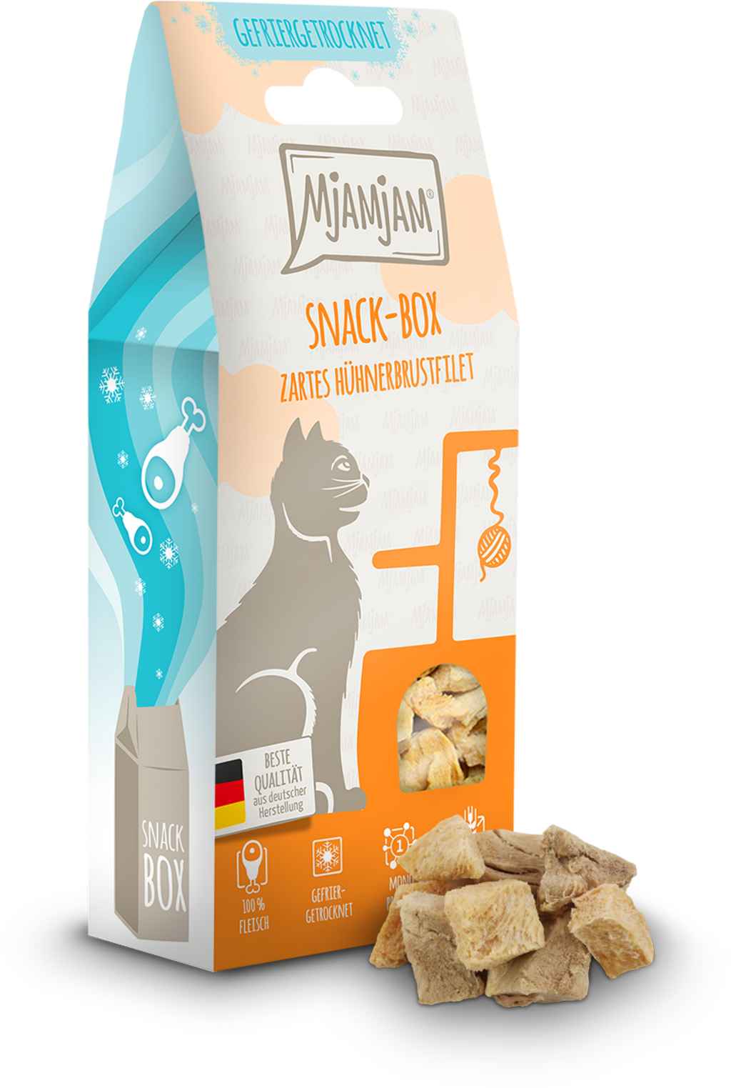 Pamlsky z Mjamjam - Snackbox jsou dokonalou odměnou pro Vaši kočku a ideálním způsobem, jak svého miláčka hýčkat. S jemnými kuřecími prsními filety, šetrně mrazem sušenými, nabízí Snackbox přírodní pochoutku, která Vaši kočku nadchne.