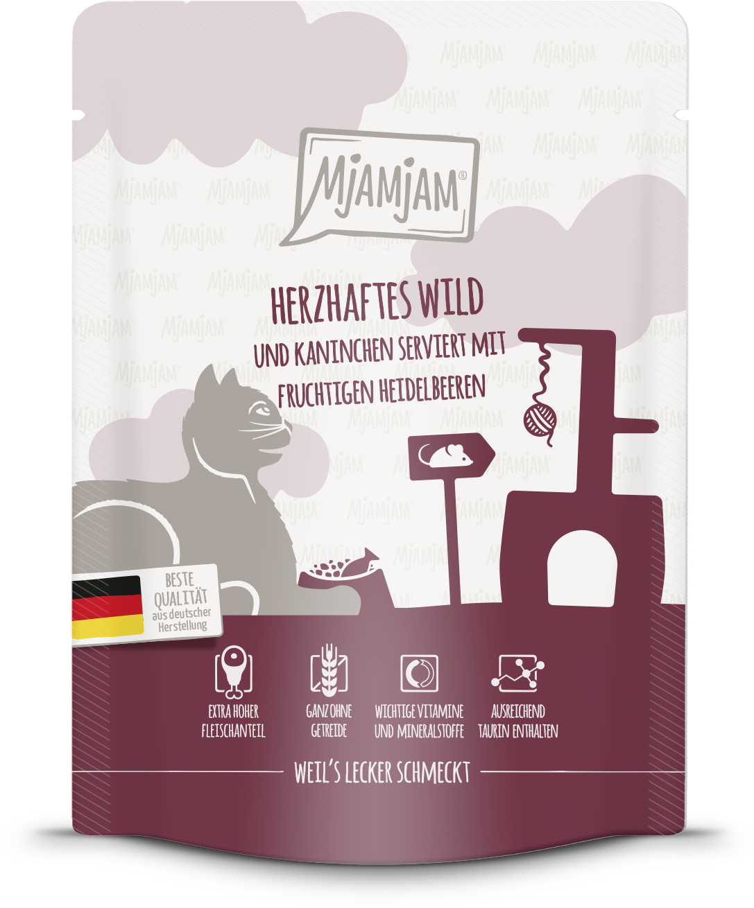 Mjamjam – kapsičky hýčkají Vaši kočku bohatou chutí, nesrovnatelnou kvalitou a špetkou lásky. Vaši kočku čeká plnohodnotné jídlo z čerstvého zvěřinového masa, jemného králíka a ovocných borůvek. Navíc obsahuje taurin, který je pro kočky nezbytný. Aby Vašemu miláčkovi nic nechybělo.