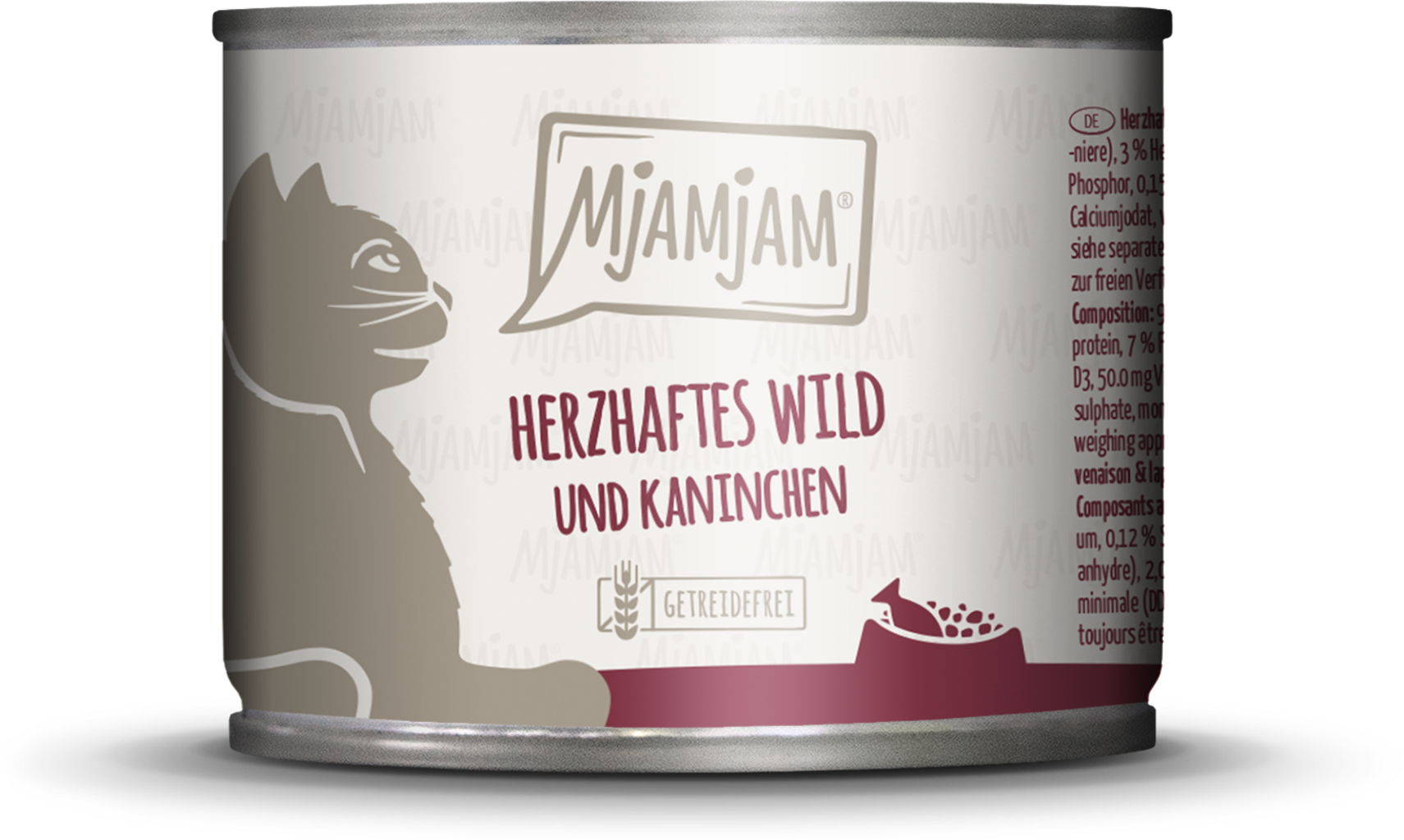 Mjamjam mokré krmivo hýčká Vaši kočku bohatou chutí, nesrovnatelnou kvalitou a špetkou lásky. Vaši kočku čeká plnohodnotné jídlo z vydatného zvěřinového masa, chutného králíka a ovocných borůvek. Aby Vašemu miláčkovi nic nechybělo.