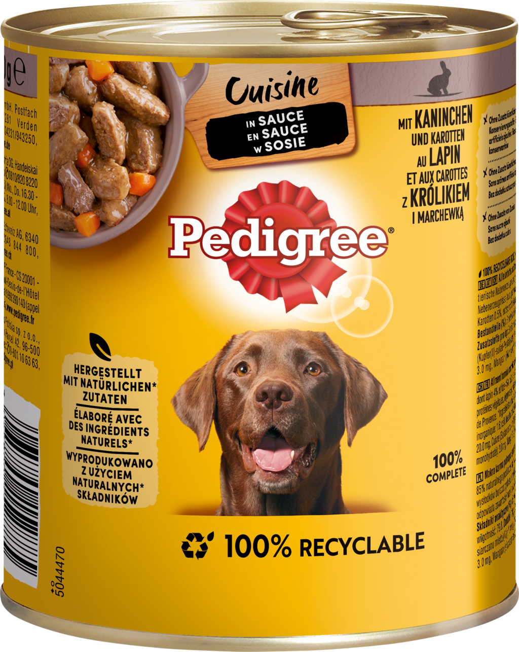 Toto gurmánské menu z čistě přírodních surovin slibuje 100% chuť a radost z vylizování misky. Lahodný králík, doplněný o mrkev a přelitý jemnou omáčkou - to je originální Cuisine od Pedigree. Pro plnohodnotné krmivo pro psy je receptura obohacena o důležité vitamíny a minerální látky.