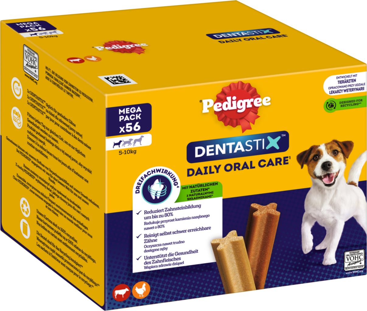 Zubní kámen představuje zdravotní riziko i pro psy. Se speciálními pamlsky, jako je Pedigree® Dentastix™, zvládnete dvě mouchy jednou ranou: díky své jedinečné konzistenci působí stick jako zubní péče - při každodenním podávání může tvorba zubního kamene klesnout až o 80 %. Tím aktivně podporujete zdraví chrupu. Toto doplňkové krmivo pro dospělé psy je zároveň aromatickým snackem s masovou příchutí, cennými vitamíny, minerálními látkami a oleji. Dentastix Small je vhodný pro psy s hmotností od 5 do 10 kg.