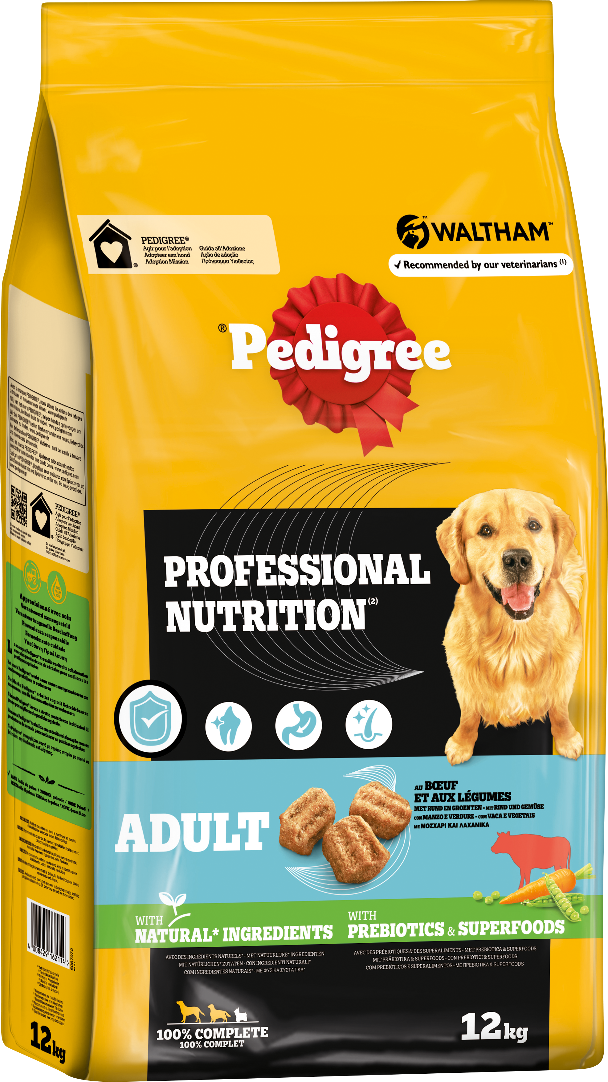 PEDIGREE® Adult Professional Nutrition nabízí dospělým psům vyváženou stravu z kvalitních surovin, jako je maso, zelenina a celozrnné obiloviny. Toto suché krmivo je vyráběno bez přidaných umělých barviv a aromat a dodává důležité živiny pro aktivní psí život.