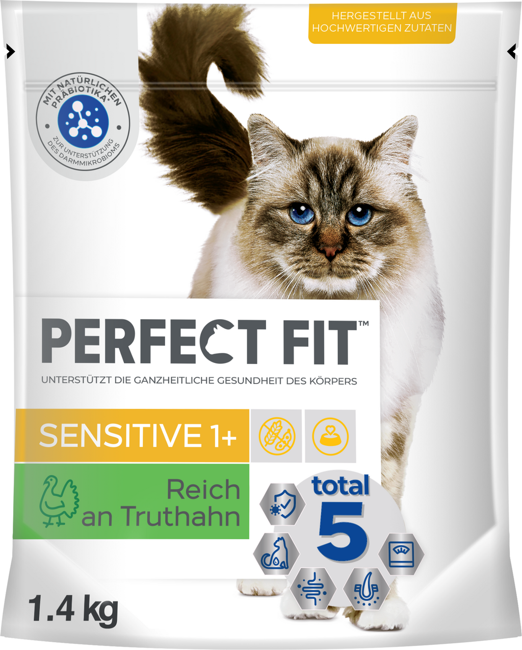 Suché krmivo Sensitive 1+ od značky Perfect Fit bylo vyvinuto speciálně pro kočky citlivé na stravu. Krmivo bohaté na bílkoviny s nízkým obsahem sacharidů neobsahuje pšenici ani sóju, protože by mohly u citlivějších koček způsobit zažívací potíže. Místo toho se chutná receptura skládá z velkého množství krůtího masa – chuti, které stěží odolá kdejaký gurmán!