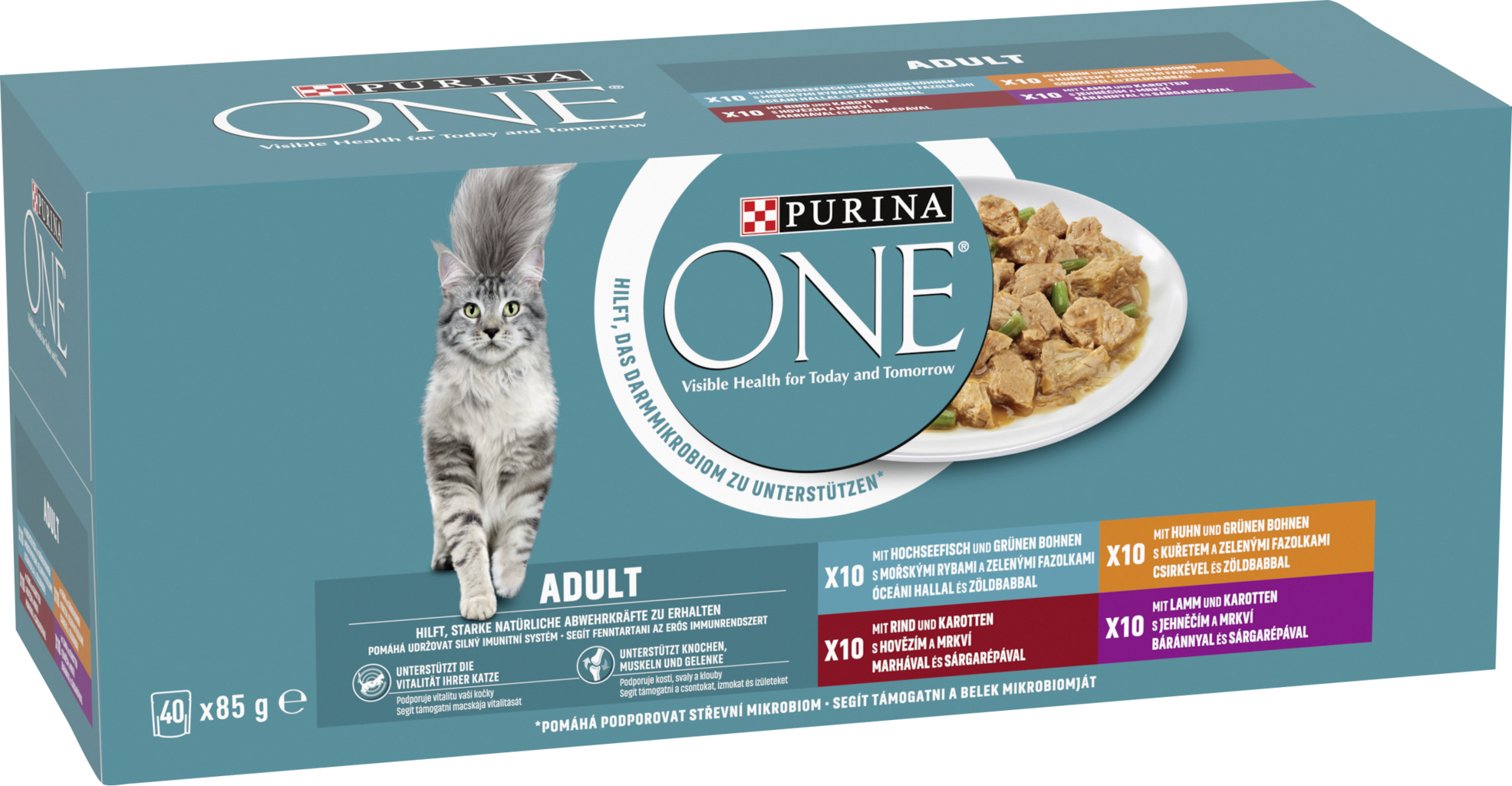 PURINA ONE Megapack Adult - kuřecí, hovězí, jehněčí, ryba 40x85 g, 3.400 g