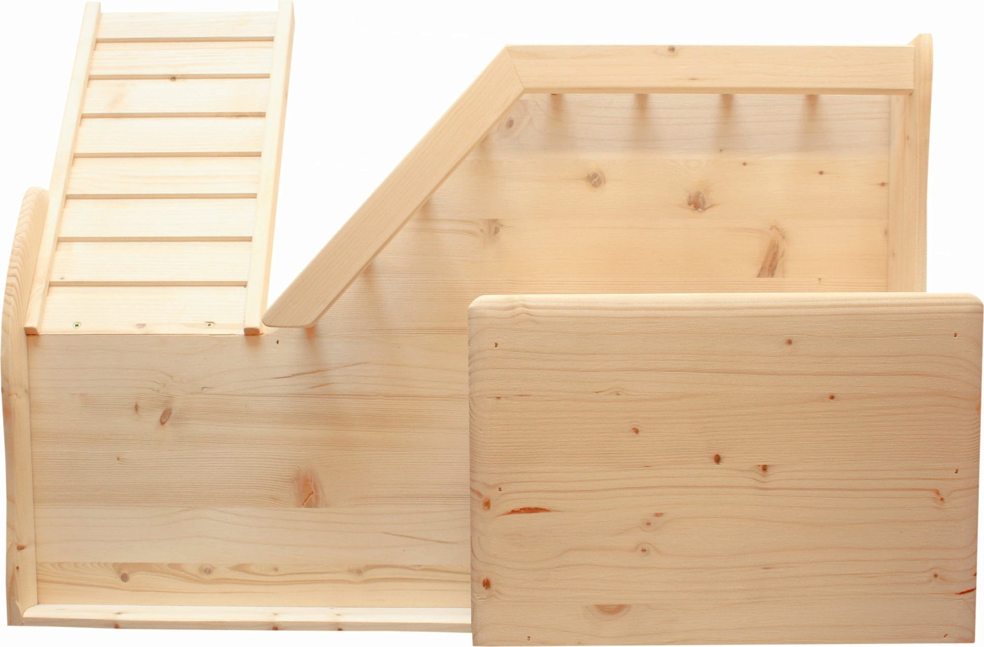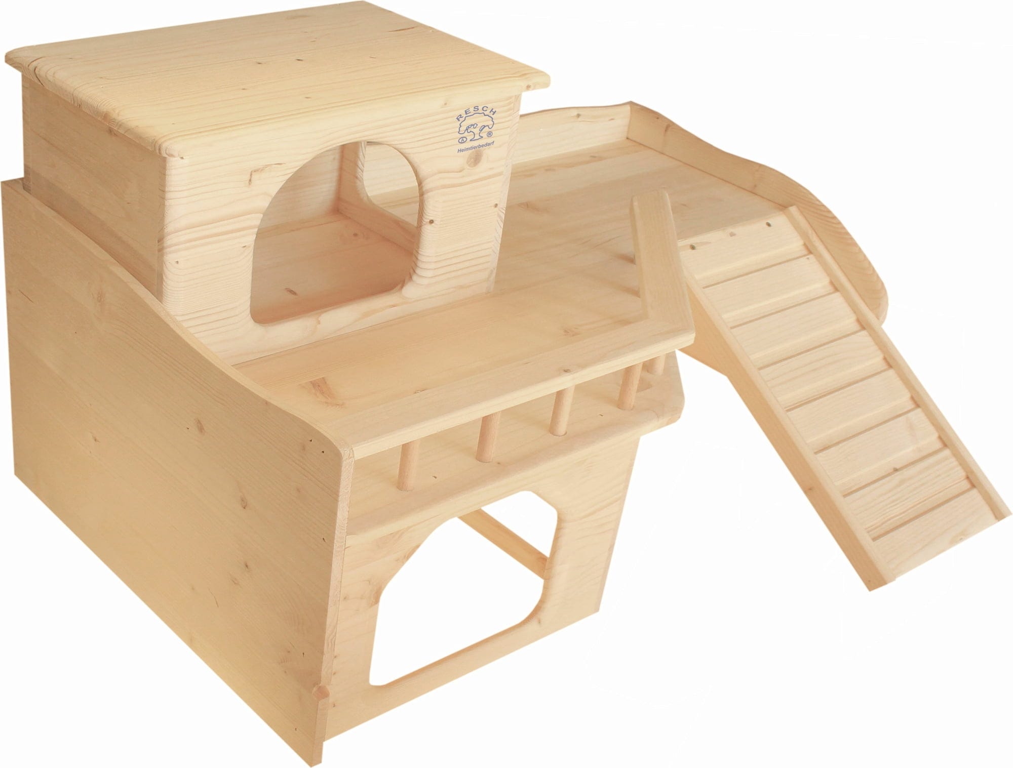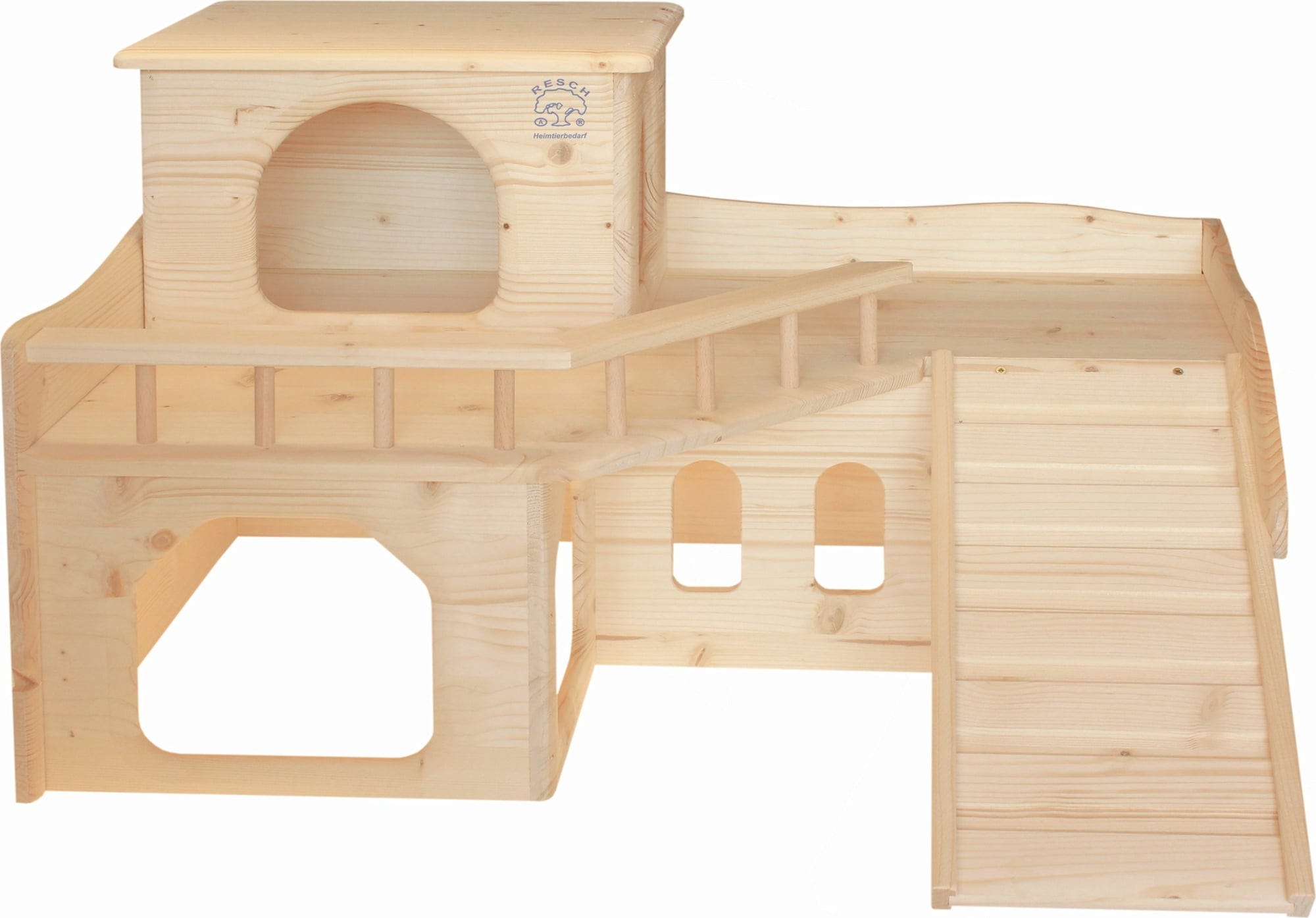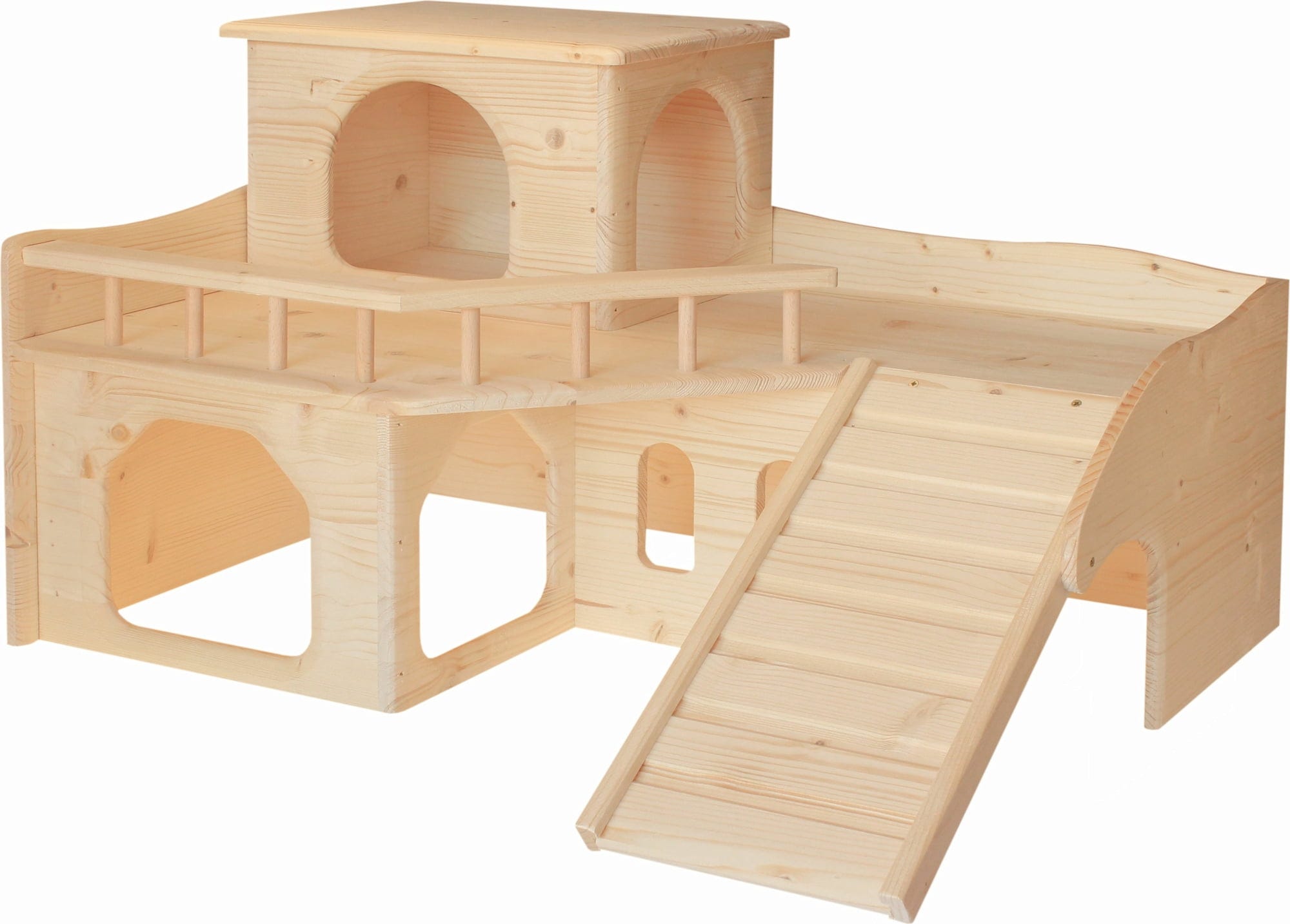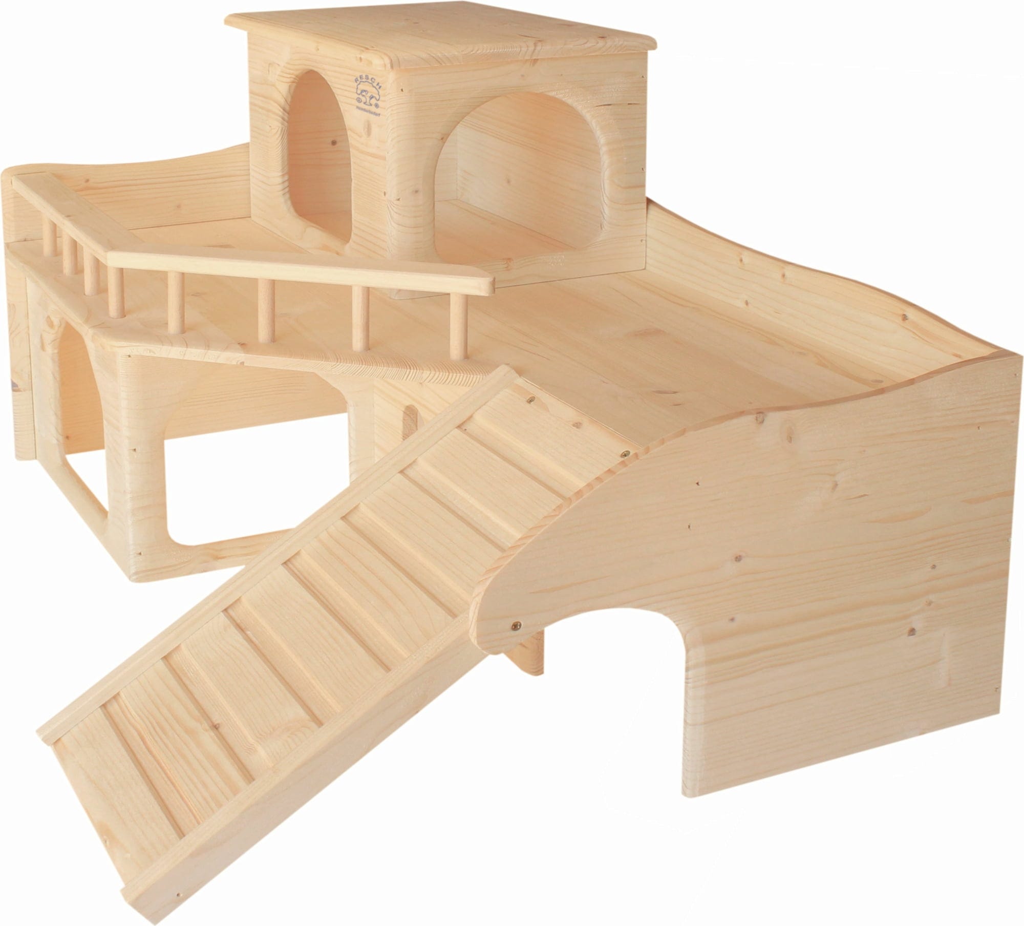 Královsky mnoho místa! Králičí hrad s věží 36 je ručně vyráběné mistrovské dílo ze smrkového dřeva, přírodní a masivní. Díky velkorysému prostoru na 2 úrovních a elegantním obloukovým otvorům mají všichni obyvatelé 24 hodin denně útulný domov.