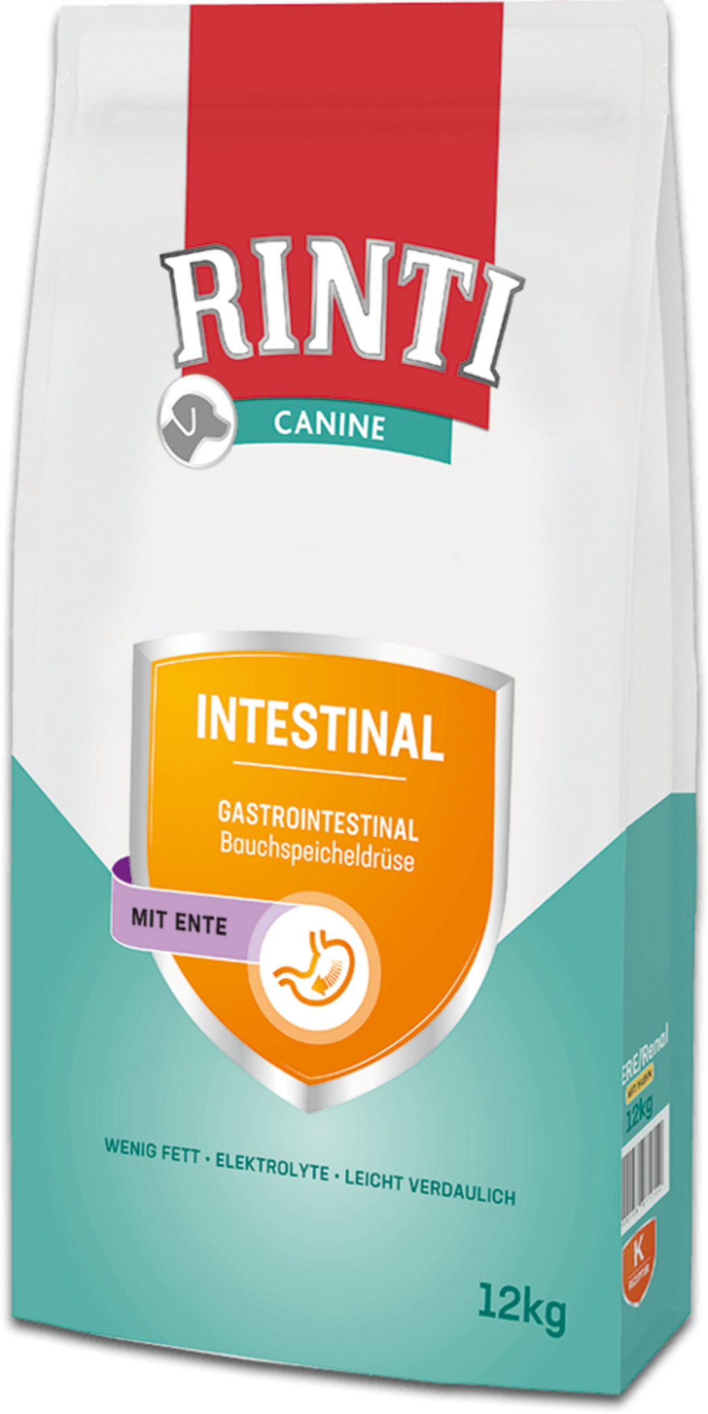 Rinti Canine Intestinal bylo speciálně vyvinuto pro psy, kteří trpí gastrointestinálními onemocněními slinivky břišní nebo žaludku a střev. Jedná se o dobře stravitelné dietní suché krmivo s nízkým obsahem tuku a zvýšeným obsahem elektrolytů (sodík, hořčík, vápník, draslík), což pomáhá kompenzovat poruchy trávení a exokrinní pankreatickou insuficienci a zmírňovat střevní resorpční poruchy.