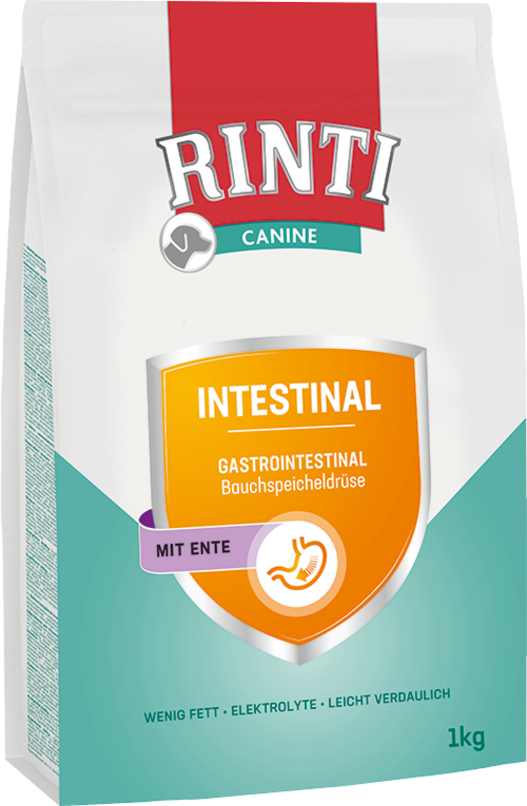 Rinti Canine Intestinal bylo speciálně vyvinuto pro psy, kteří trpí gastrointestinálními onemocněními slinivky břišní nebo žaludku a střev. Jedná se o lehce stravitelné dietní suché krmivo s nízkým obsahem tuku a zvýšeným obsahem elektrolytů (sodík, hořčík, vápník, draslík), což pomáhá kompenzovat poruchy trávení a exokrinní pankreatickou nedostatečnost a také zmírňovat střevní resorpční poruchy.