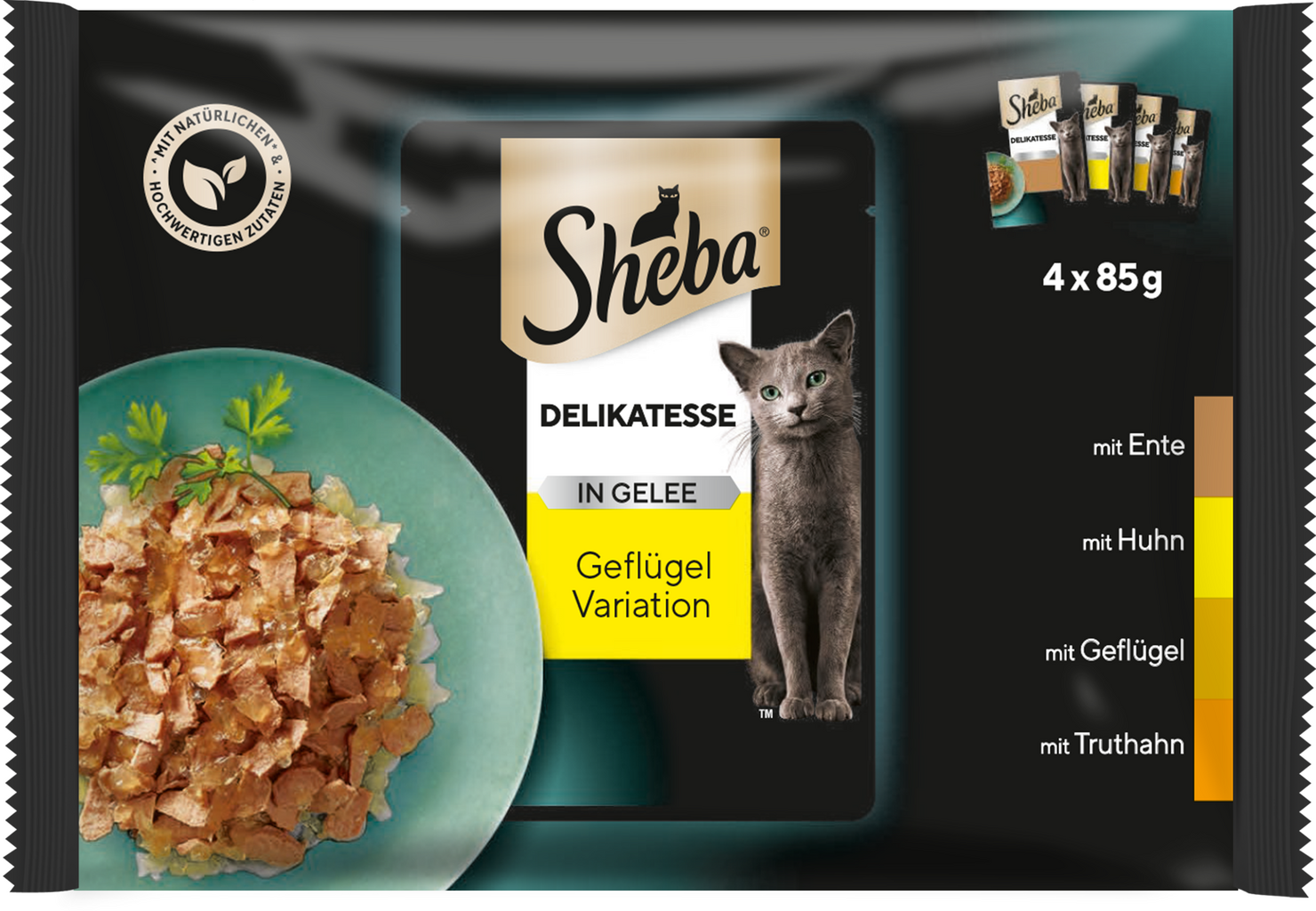 Chcete svou kočku delikátně rozmazlovat? Šťavnaté masové kousky v želé jsou pro každou kočku opravdovou lahůdkou! Každé balení obsahuje čtyři druhy, přičemž dostanete čtyři porce po 85 g. Pečlivě vybrané suroviny, nulový obsah umělých barviv, konzervantů a aromat - receptura je kvalitní a neobsahuje žádné zbytečnosti.