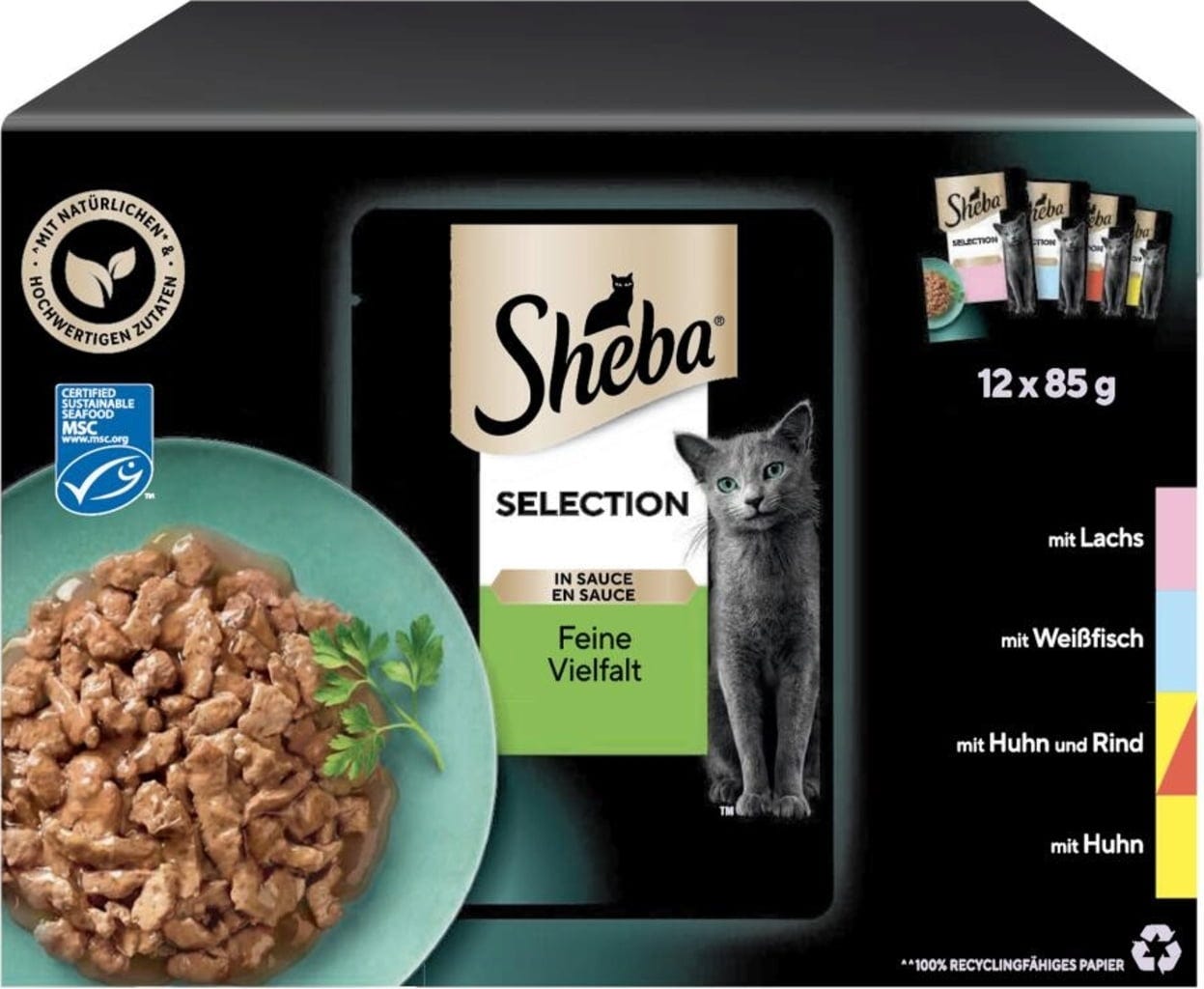 Sheba Selection je každodenní luxusní menu pro dospělé kočky: Šťavnaté masové kousky v lahodné omáčce potěší i ty nejnáročnější mazlíčky a obměkčí i skutečné bručouny. Každé balení obsahuje čtyři druhy, např. výběr drůbeže s lososem, bílou rybou, kuřetem a hovězím. V balení najdete 12 kapsiček po 85 g.