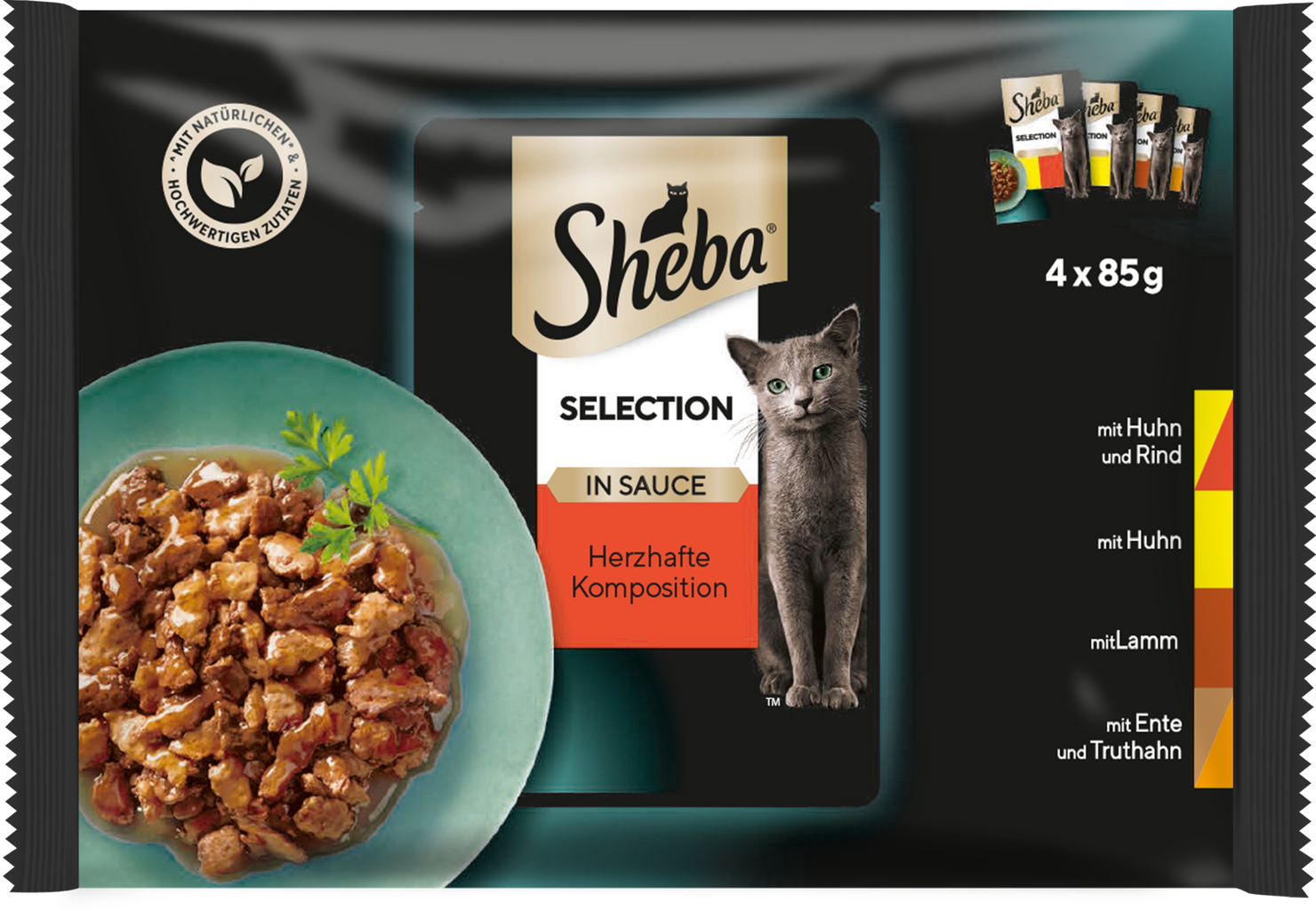 Sheba Selection nabízí chutné menu variace pro každodenní gurmánský zážitek: Šťavnaté masové kousky v lahodné omáčce potěší i ty nejnáročnější kočky a obměkčí i opravdové mrzouty. Každé balení obsahuje čtyři druhy, např. kuře a hovězí, jehněčí, kachnu a kombinaci krůty s kuřetem. V balení dostanete 4 čerstvé kapsičky po 85 g; krmivo slouží jako kompletní potrava pro dospělé kočky.