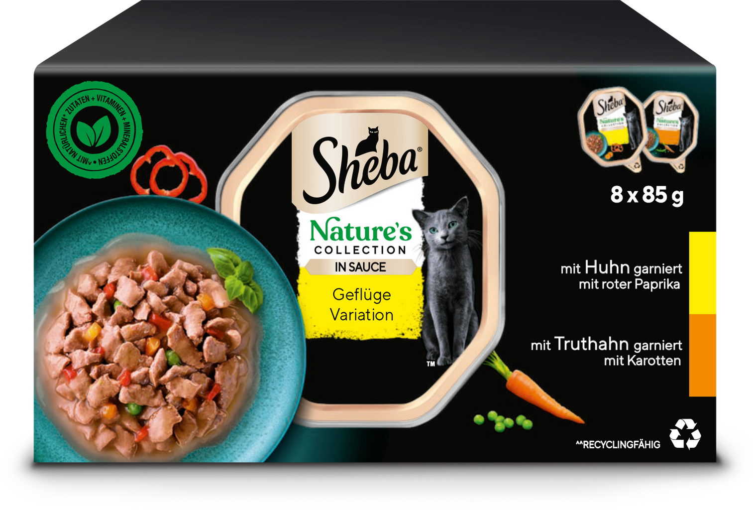 Objevte umění kulinářského svádění s lahodnými recepturami Sheba Nature's Collection: Každé krmivo je mistrovské dílo z vybraných přírodních surovin v omáčce - bez jakýchkoliv barviv a konzervantů!
