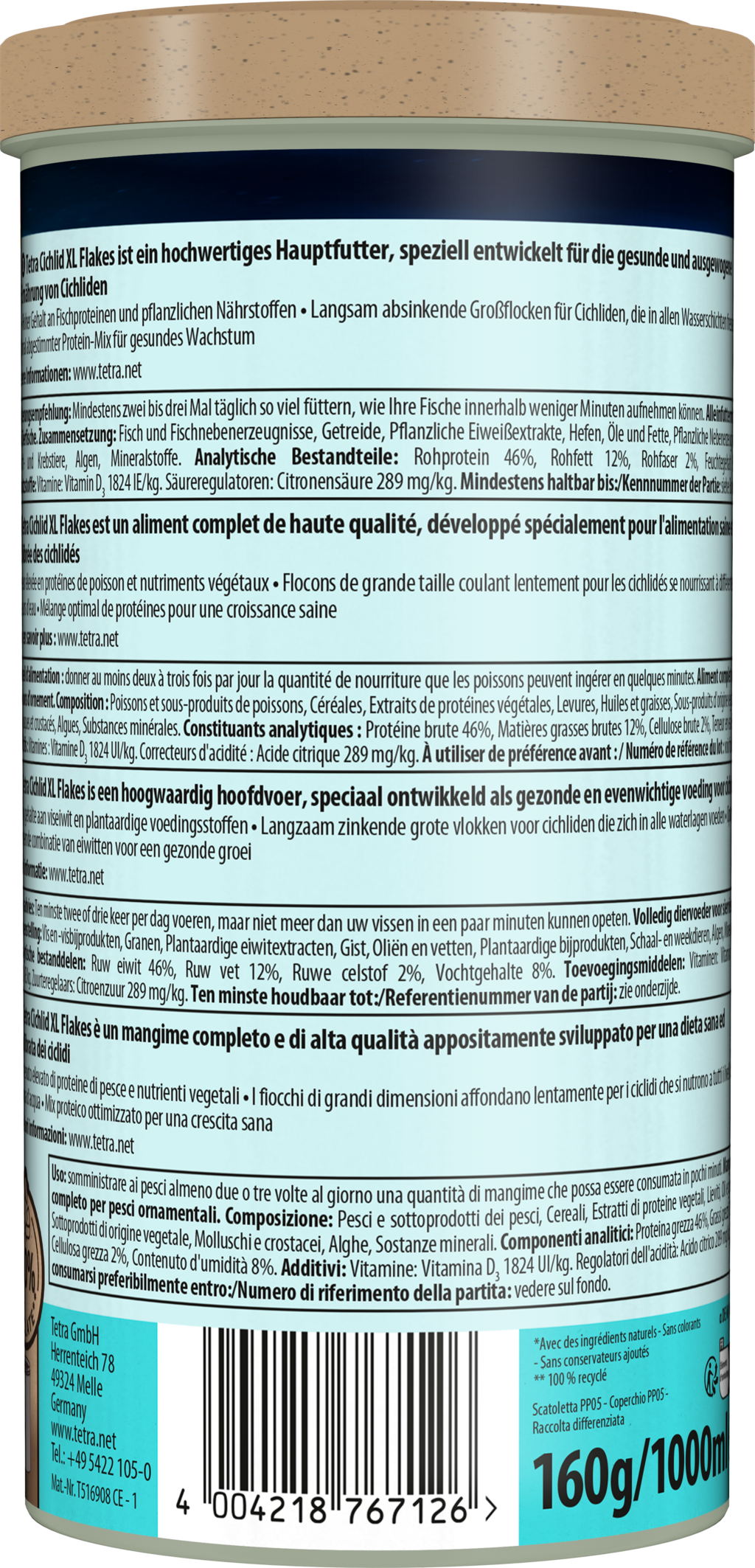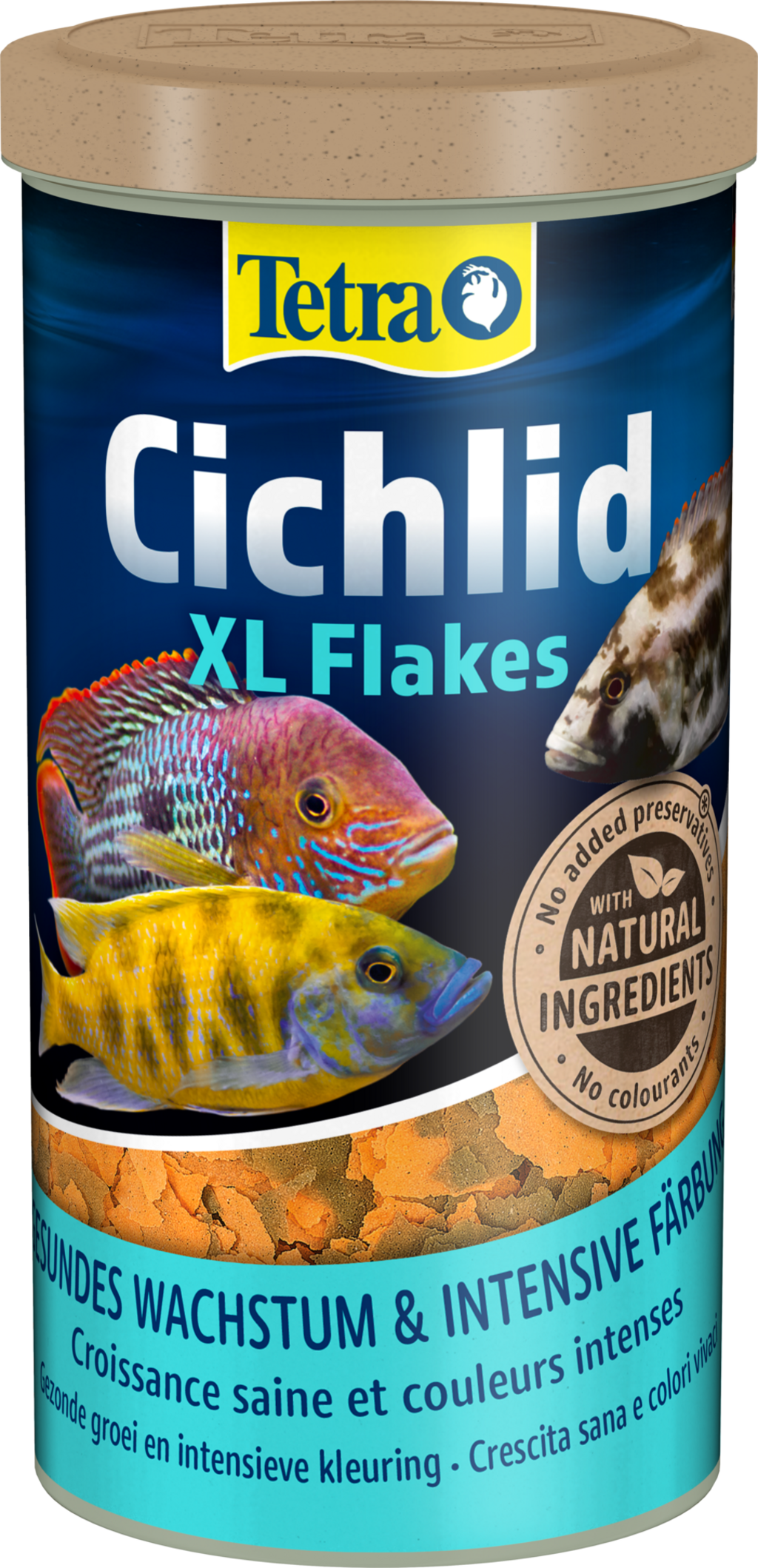 Díky vysokému podílu rybích bílkovin a rostlinných živin umožňuje Tetra Cichlid XL vločkové krmivo Vašim cichlidám vyváženou a zdravou stravu. Se svými pomalu potápějícími se velkými vločkami je vhodné pro cichlidy, které se živí ve všech vrstvách vody a odpovídá přirozeným predátorským a potravním návykům těchto ryb.
