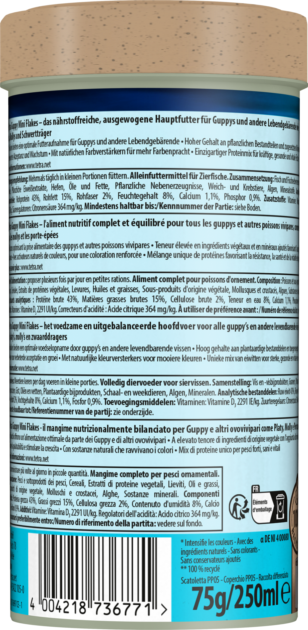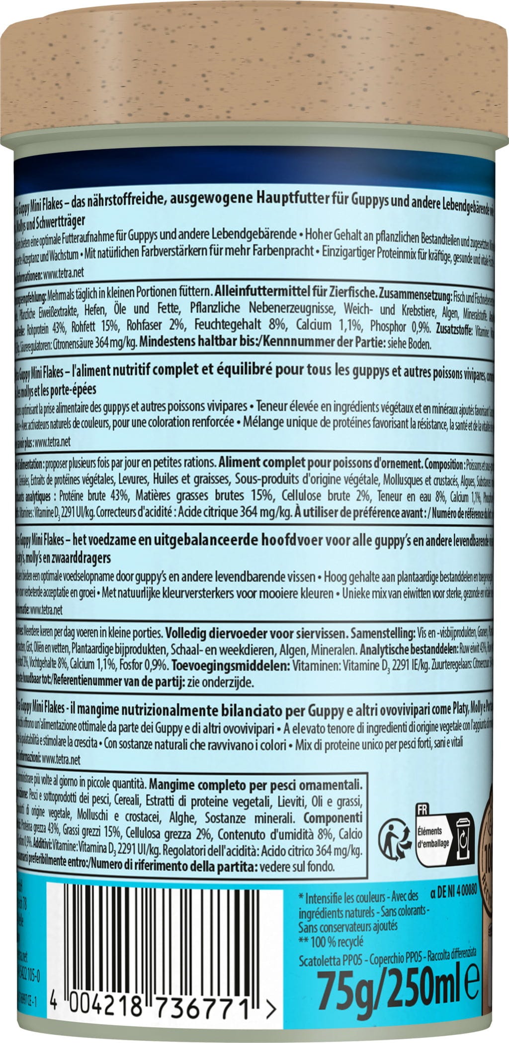Tetra Guppy Mini Flakes je vysoce kvalitní základní krmivo ve formě vloček pro okrasné ryby živorodky ve sladkovodních akváriích.
