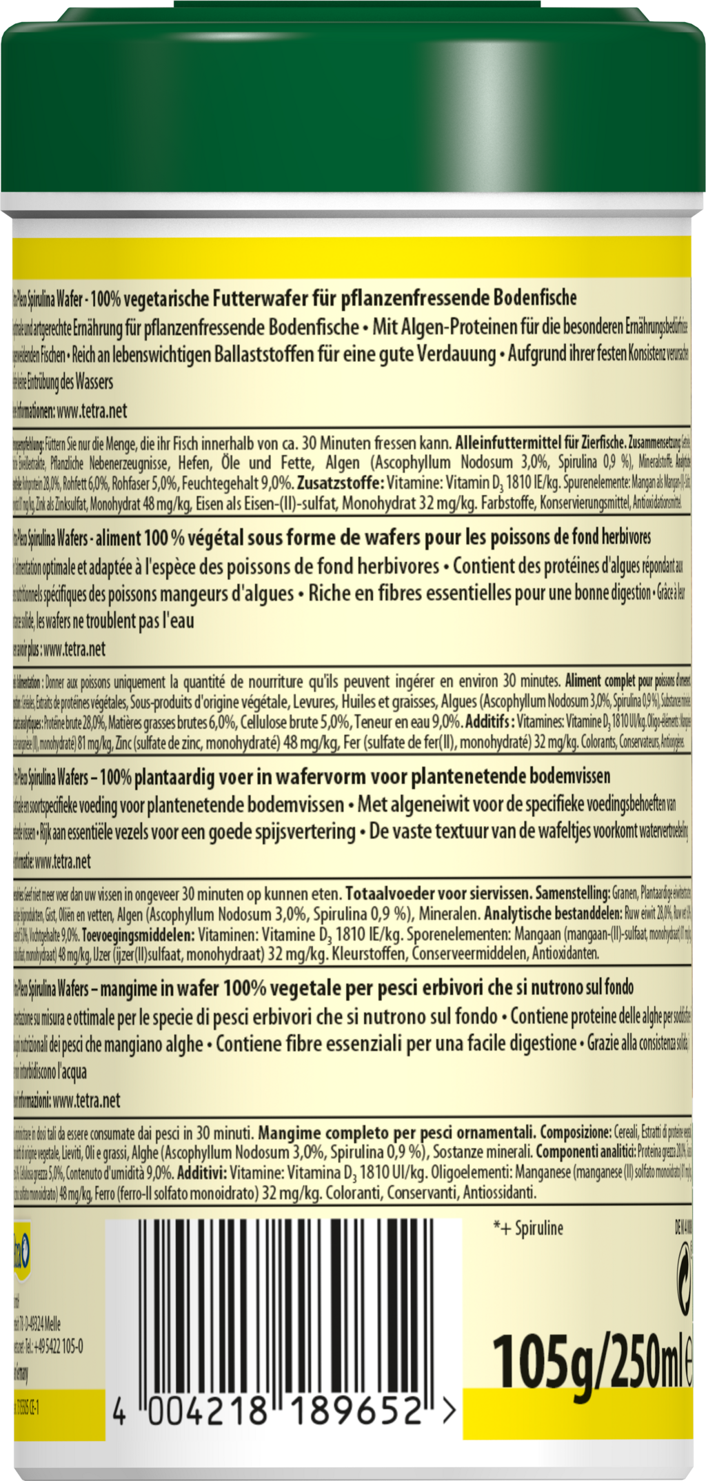 Toto 100% rostlinné krmivo ve formě oplatek je určeno pro všechny býložravé ryby živící se u dna sladkovodních akvárií. Krmivo je bohaté na minerální látky a zajišťuje tak dobrou kondici i vitalitu, zatímco vitální vláknina prospívá dobrému trávení. Oplatky mají průměr 16-19 mm a díky jejich pevné konzistenci nedochází k zakalování vody.