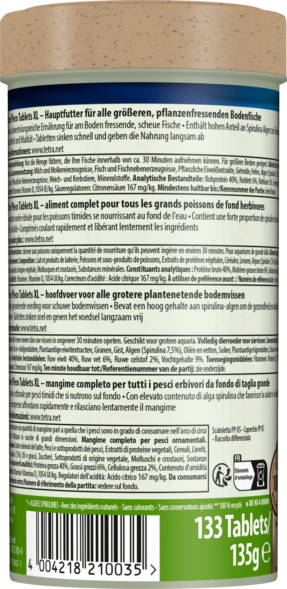 Pleco XL Tablets je kompletní krmivo ve formě tablet pro všechny býložravé ryby živící se u dna sladkovodních akvárií. Tablety se rychle potápějí, lze je snadno umístit a pomalu se rozpouštějí. Díky novému složení obsahuje krmivo vysoký podíl spiruliny pro podporu zdraví a vitality. Tablety mají průměr 16 mm.