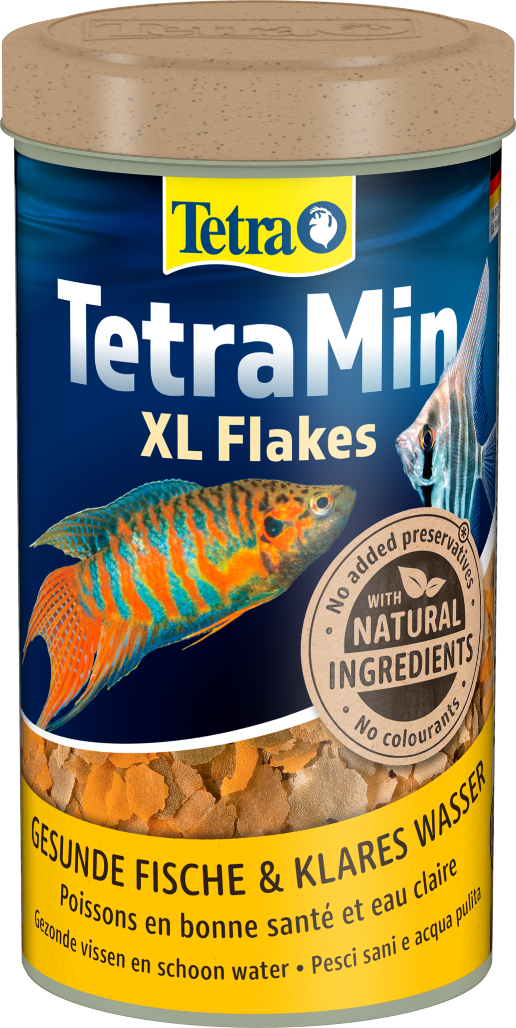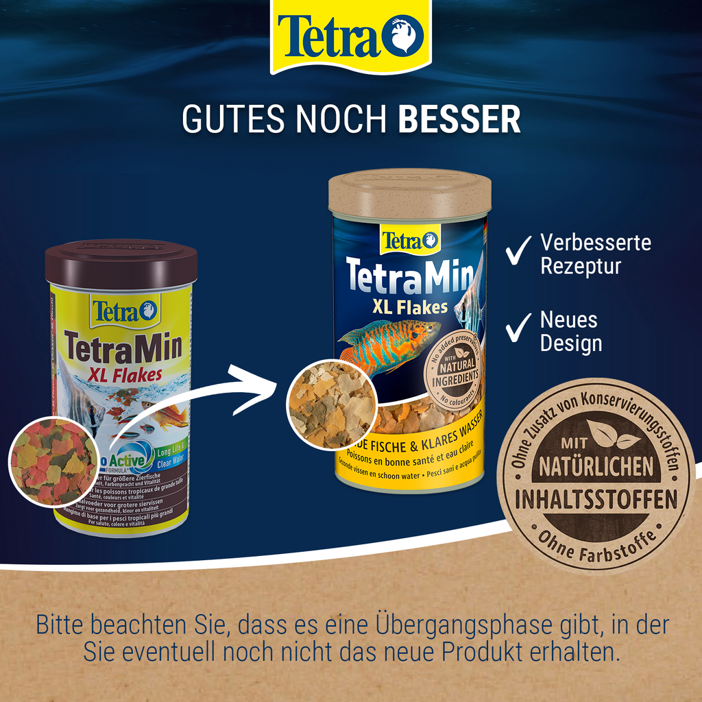 TetraMin XL je biologicky vyvážené základní krmivo s extra velkými vločkami pro velké tropické okrasné ryby ve sladkovodních akváriích.