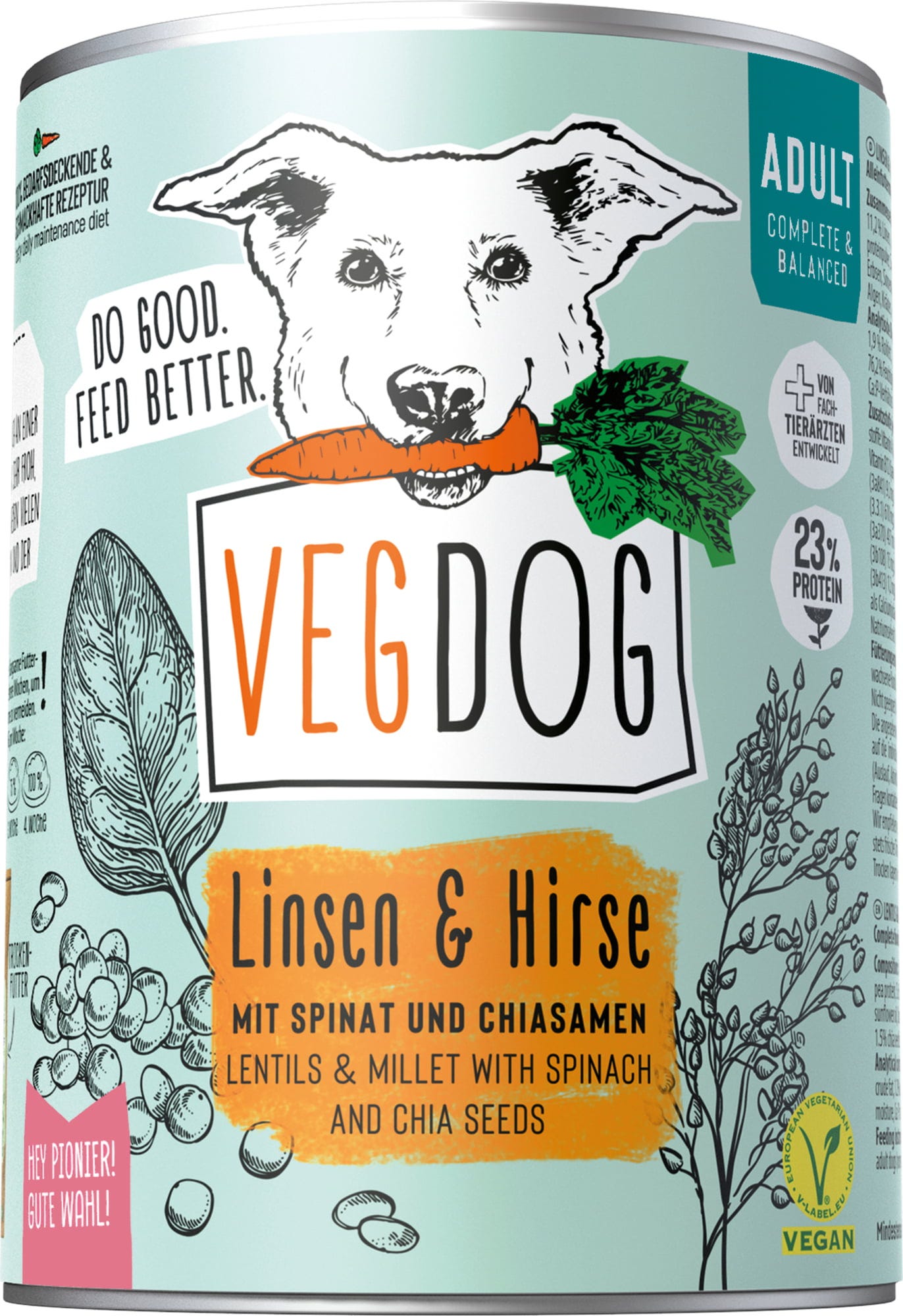 VEGDOG Adult – mokré krmivo v konzervě seznamuje psy s novými zajímavými chutěmi! Veganská receptura kombinuje syté ovesné vločky, lupinové a hrachové proteiny a poskytuje důležité živiny, které psi od prvního roku života potřebují. Do této speciální směsi byly přidány řasy a lněné semínko, aby bylo krmivo obohaceno o esenciální omega-3 a omega-6 mastné kyseliny.