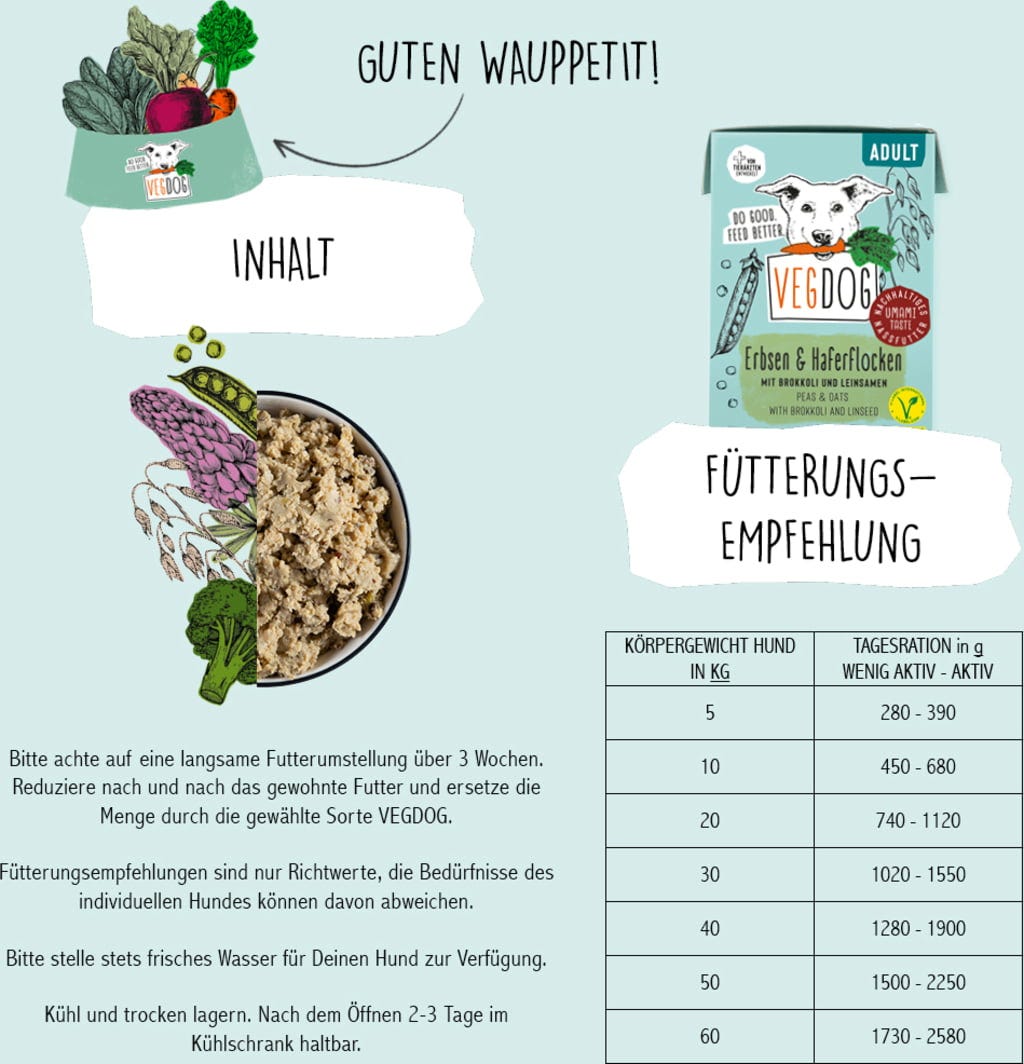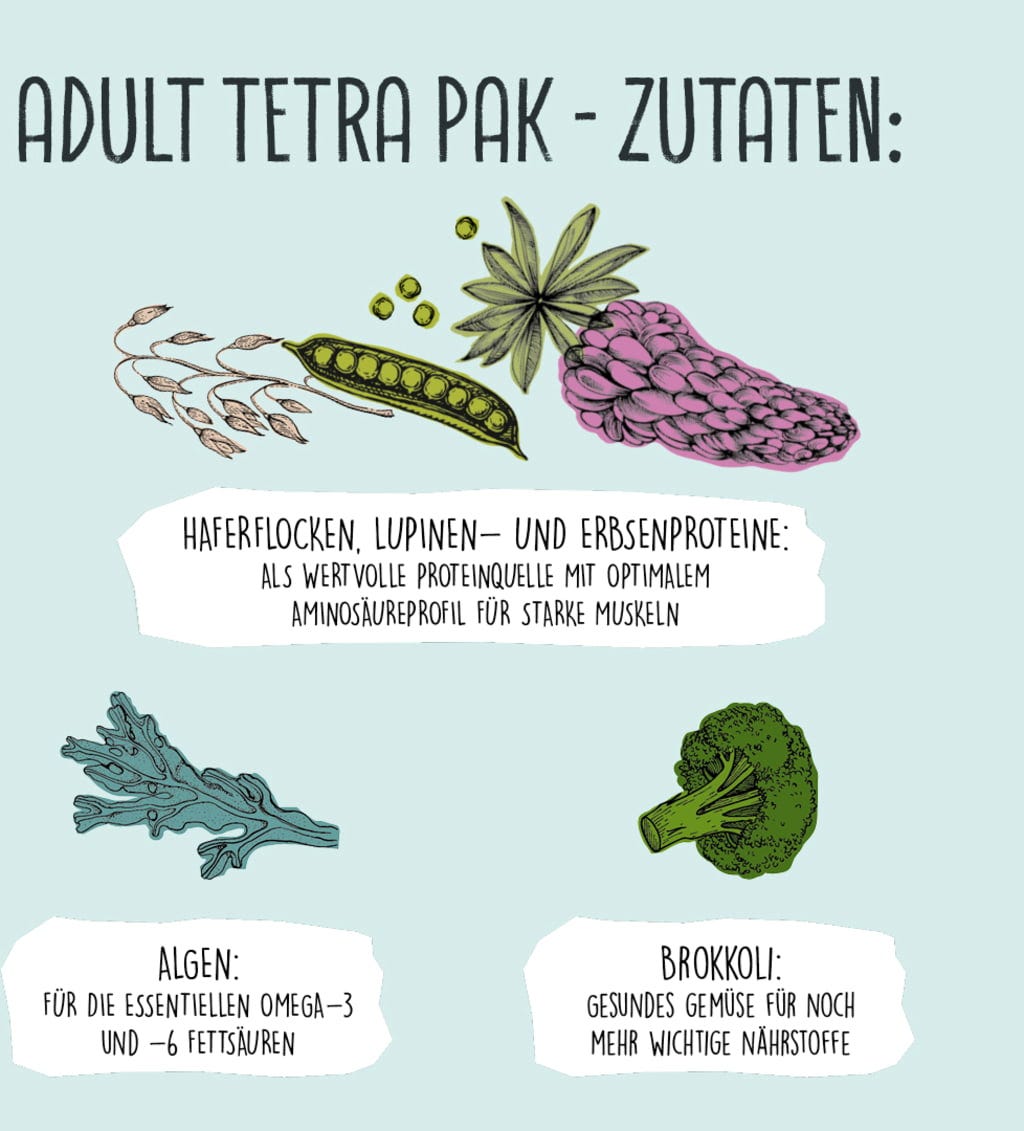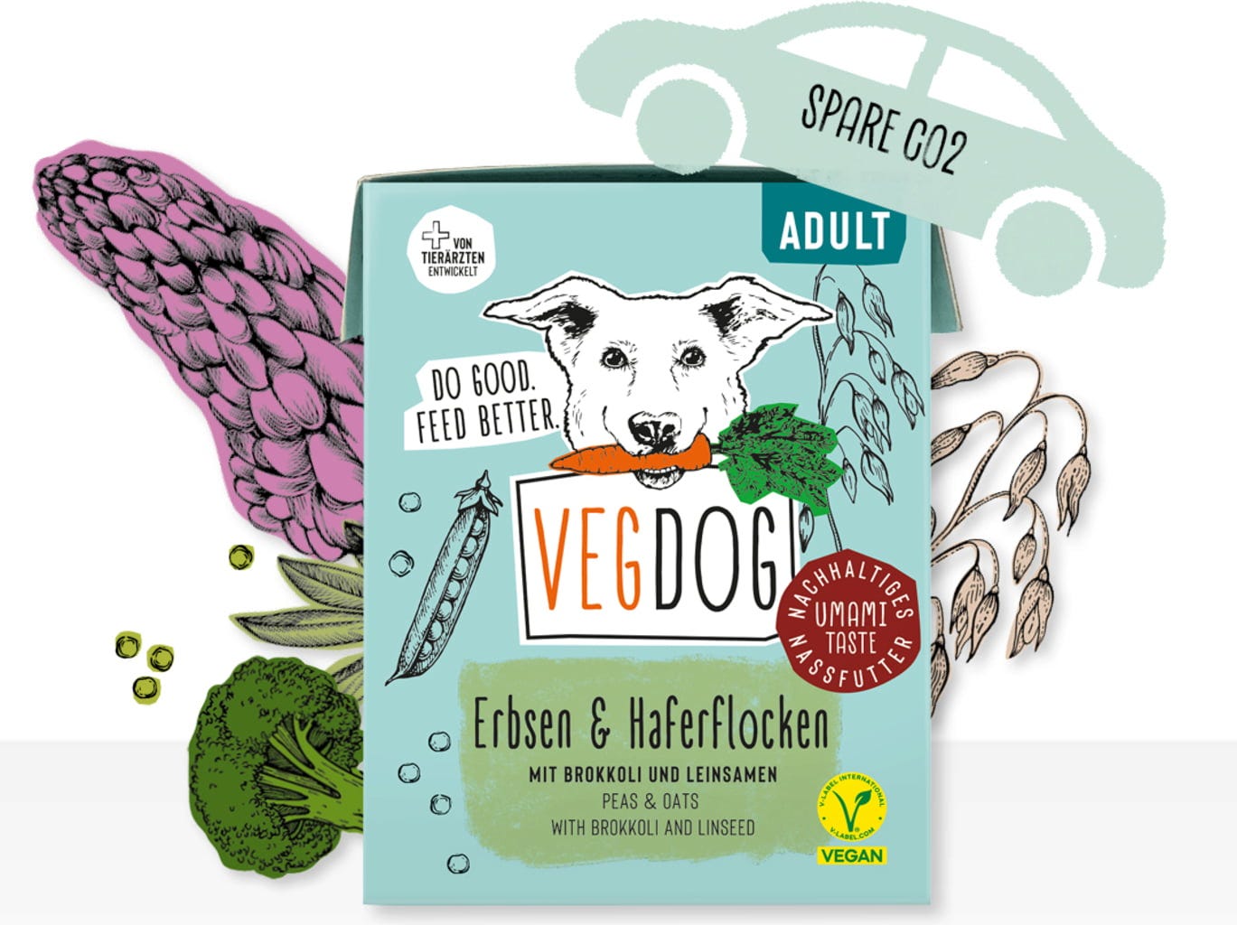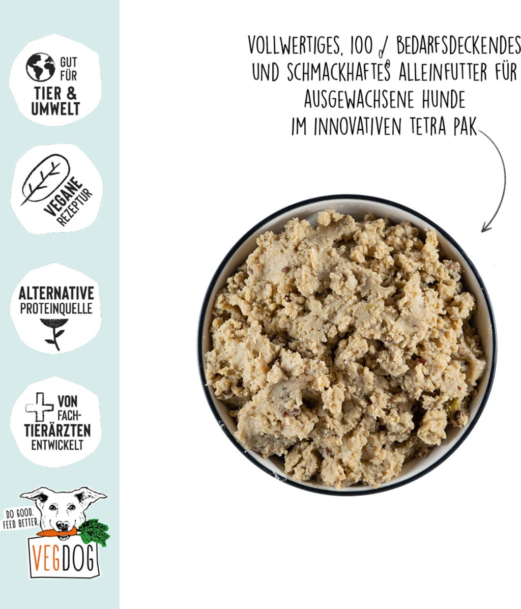 VEGDOG mokré krmivo pro dospělé v Tetra Paku nejenže mění svět obalů krmiv pro psy, ale také seznamuje psy s novými chutěmi! Veganská receptura kombinuje syté ovesné vločky, lupinové a hrachové proteiny a dodává důležité živiny, které psi od prvního roku života potřebují. Do speciální směsi byly přidány řasy a lněné semínko, aby bylo krmivo obohaceno o esenciální omega-3 a omega-6 mastné kyseliny.