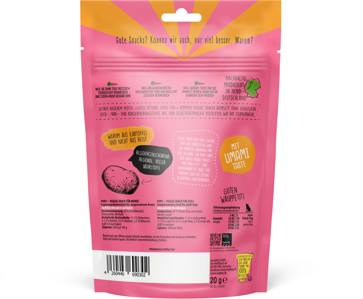 Chcete svého miláčka při tréninku odměnit a přesto hlídat jeho linii? VEGDOG vyvinul se svými Pops pamlsky pro psy, které jsou ideální jako nízkokalorický tréninkový pamlsek. Malé pufované pamlsky se skládají pouze ze 3 ingrediencí a obsahují méně než 1 kcal na kus. Dominuje chuť brambor, kterou psi obzvláště milují. Přirozené mlsání jednoduše!