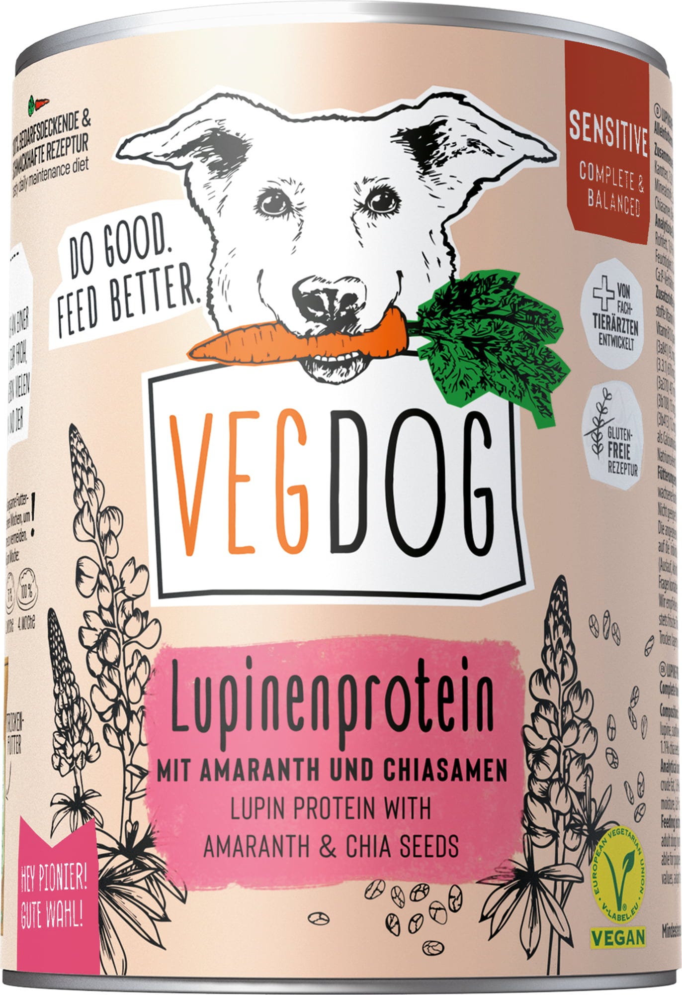 VEGDOG Sensitive mokré krmivo v konzervě seznamuje psy s novými, mimořádně zajímavými příchutěmi! Veganská receptura kombinuje syté proteiny z čočky, lupiny a amarantu a dodává důležité živiny, které psi potřebují od prvního roku života. Do speciální směsi byly začleněny řasy a chia semínka, aby bylo krmivo obohaceno o esenciální omega-3 a omega-6 mastné kyseliny. Speciální minerální prášek vyvinutý společností VEGDOG obsahuje dostatek vitaminu B12, taurinu a karnitinu; bylinky jako pampeliška, meduňka a heřmánek navíc podporují lehké složení.