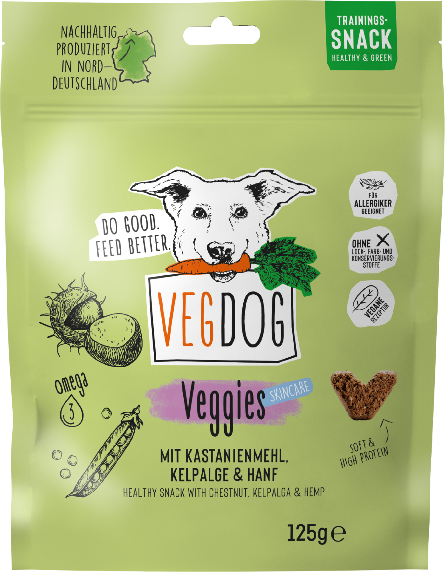 Pamlsky nemusí nutně chutnat po mase, aby byly vynikající! VEGDOG Veggies Skincare jsou chutné veganské pamlsky s hypoalergenní recepturou, která je vhodná pro psy s alergiemi na krmivo. Směs kořeněného aroma kouře z bukového dřeva a jedinečné chuti kaštanů a hrášku dělá z těchto rostlinných pamlsků výjimečný gurmánský zážitek. Tyto delikátní pamlsky využívají řasu kelpu a konopná semínka jako rostlinnou alternativu k rybímu oleji. Neodolatelná chuť, lehce stravitelné pro žaludek!